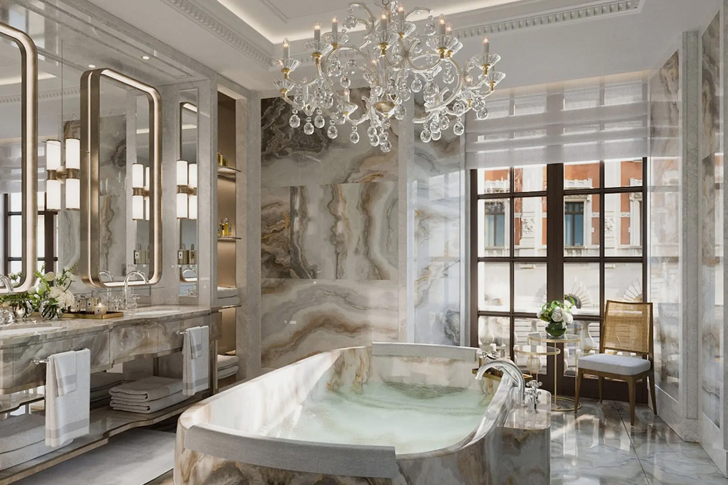 Дом, построенный в начале XX века, владельцы бренда Corinthia, братья-миллиардеры Дэвид и Саймон Рубен, приобрели в 2019-м и потратили несколько лет (и, очевидно, немалые средства) на реставрацию почти 10 тысяч квадратных метров. Мраморные панели, фрески 1920-х годов кисти Джулио Баргеллини, резное дерево — все это сохранено, обновлено и не спорит с современной отделкой, разработанной лондонским бюро GA Design. В ванных комнатах использовано более дюжины разновидностей мрамора, и это воспринимается не как излишество, а как продолжение римской традиции работать с камнем.