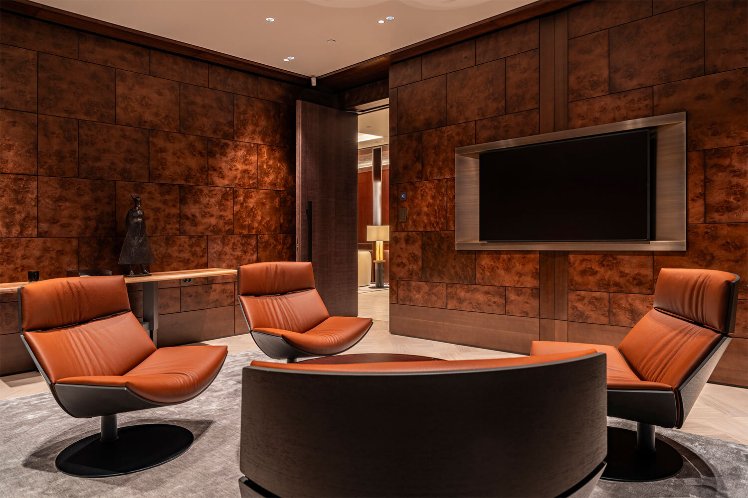 Р езиденция бренда коллекционной недвижимости MR Private девелопера MR Group площадью около 800 кв. м была спроектирована студией дизайна и архитектуры Андрея Зайцева Elforma Studio. Центральной темой проекта, расположенного в бизнес-центре «Романов Двор», стал оммаж яхтенной эстетике с ее безупречными стандартами роскоши и вниманием к деталям. Пространство решено в форме классической анфилады, что позволяет оценить масштаб замысла. Входная группа выполнена в форме палубы яхты, в интерьере же этот мотив поддерживают такие оригинальные элементы, как, например, спинки кресел в одной из переговорных комнат, стилизованные под морские узлы. Сам интерьер выдержан в фирменной палитре MR Private: бежевый паркет из натурального дуба, плиты из мраморизованного известняка, лакированный шпон из красного дерева и золотые металлические акценты. Резиденция – это не просто бутик проектов недвижимости, а многофункциональное пространство, объединяющее галерею современного искусства, библиотеку, переговорные комнаты и музейную экспозицию.