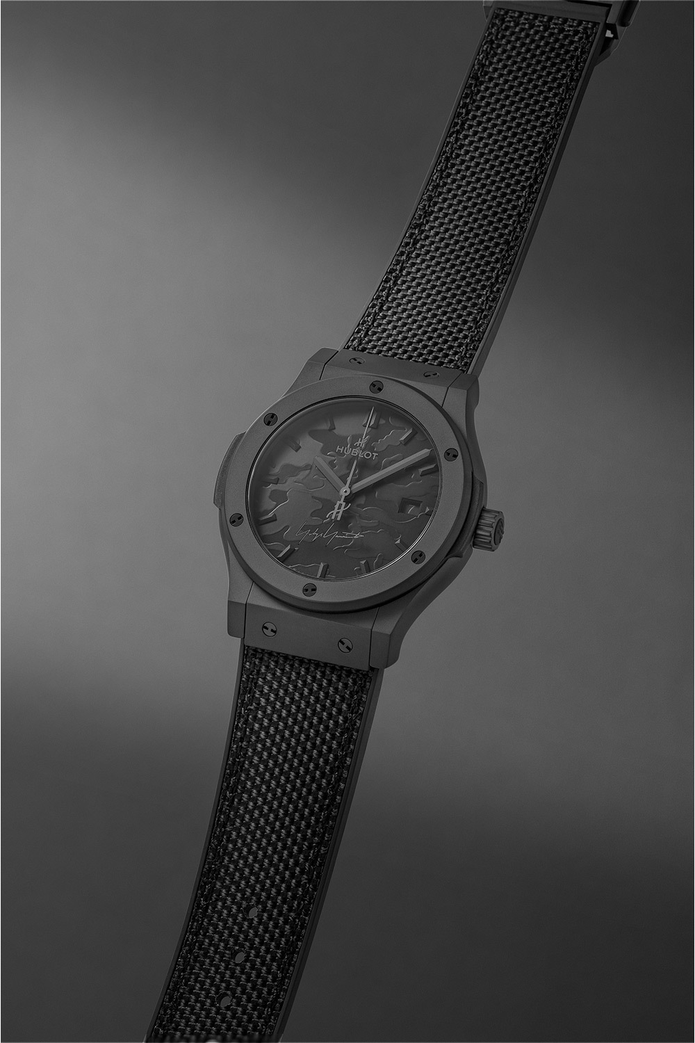 Ч асы Classic Fusion Yohji Yamamoto All Black Camo, выпущенные в начале 2026 года тиражом всего 300 экземпляров, становятся своеобразной кульминацией философии total black, которую Hublot и дизайнер последовательно развивают с первой совместной модели. Здесь эффект роскоши достигается не за счет цвета, а за счет фактуры: рельефный монохромный камуфляж реагирует на свет, и при движении запястья его рисунок то уходит в глубину, то выступает на передний план, заменяя привычные яркие акценты спокойной, почти графичной игрой поверхности.