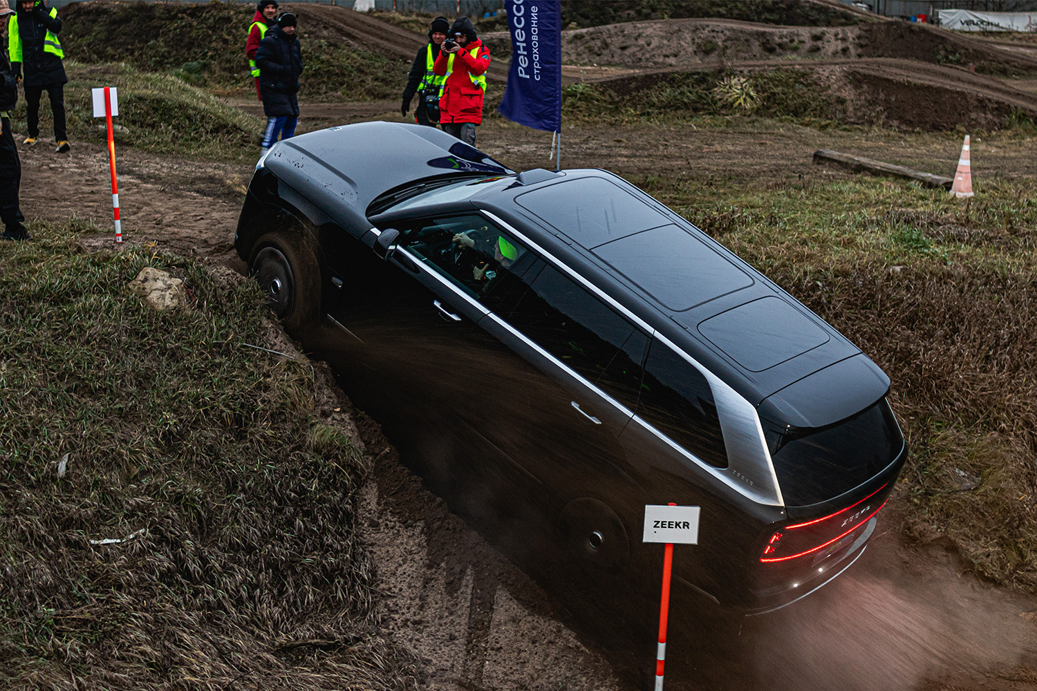 Внедорожник с пониженной передачей, возможно, смог бы взобраться, но у Zeekr колёса слишком резко срываются в пробуксовку — и он мгновенно зарывается. Подъём не взят.