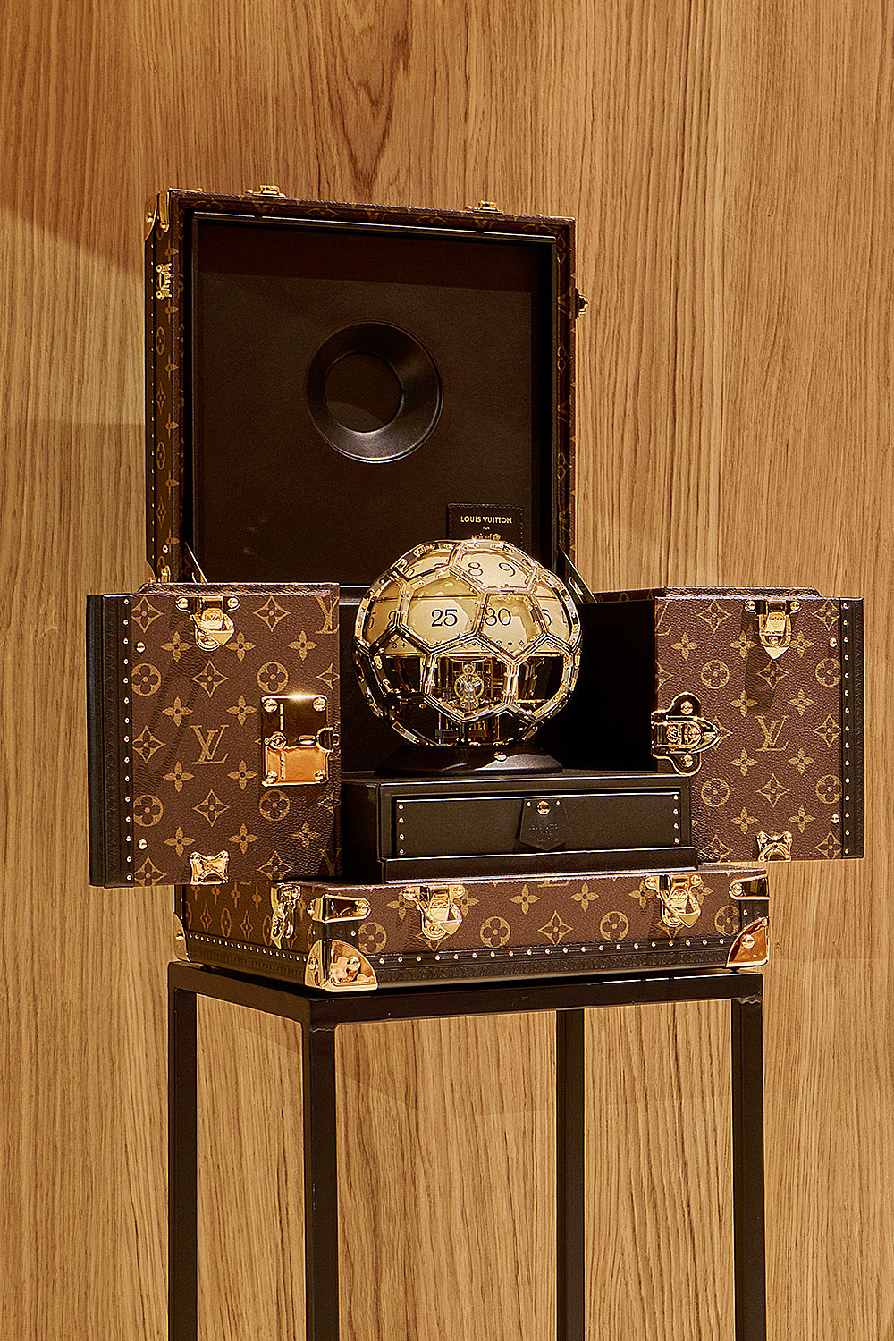 Э тот арт-объект продолжает давнюю коллаборационную традицию бренда, связанную со спортом. Дизайн этих настольных часов напрямую отсылает к культовому монограммовому футбольному мячу, который Louis Vuitton разработал для чемпионата мира FIFA 1998 года во Франции. Прозрачный сферический корпус, собранный из шести- и пятиугольных панелей, позволяет рассмотреть внутренний механизм. Часовой калибр с ручным заводом был создан известной швейцарской мануфактурой L’Epée 1839, специализирующейся на эксклюзивных настольных часах. Время показывают вращающиеся золотые цилиндры, а инкрустированные в корпус бриллианты служат изящными акцентами.