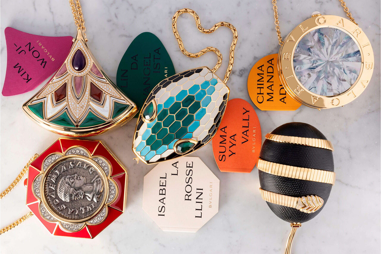 Минаудьер Monete воссоздает в новом масштабе древнеримскую монету в обрамлении драгоценной эмали, цилиндрическая модель с перламутровой интарсией ручной работы отсылает к коду Bvlgari Bvlgari, а хищная голова Serpenti превращена в самостоятельный «носибельный» объект.