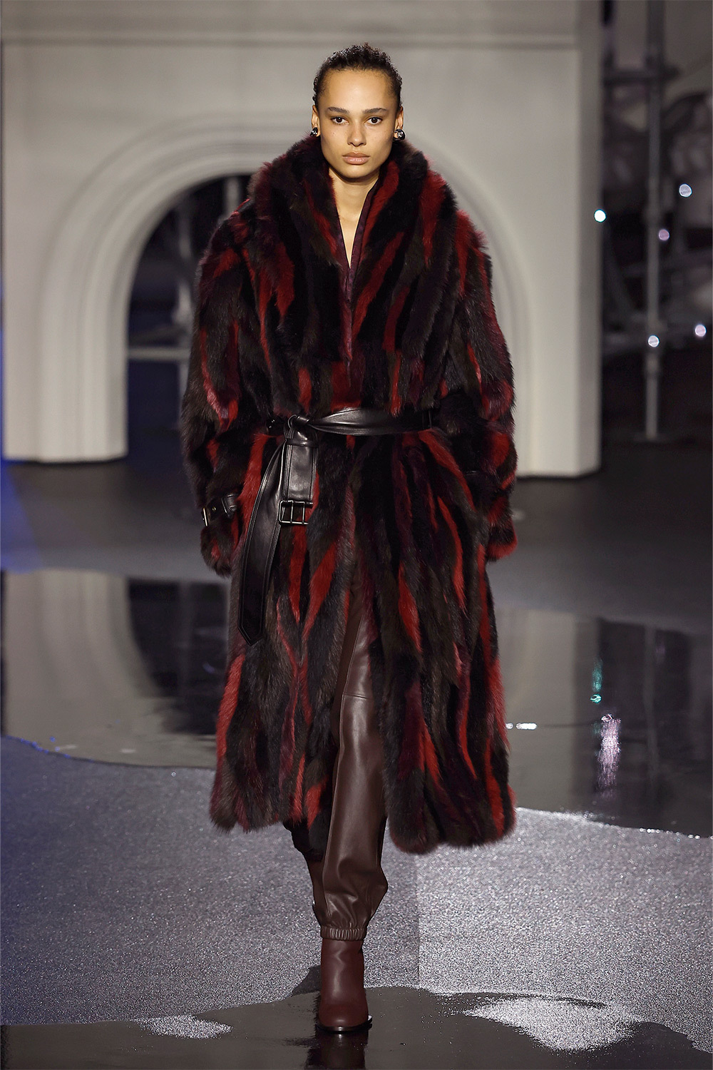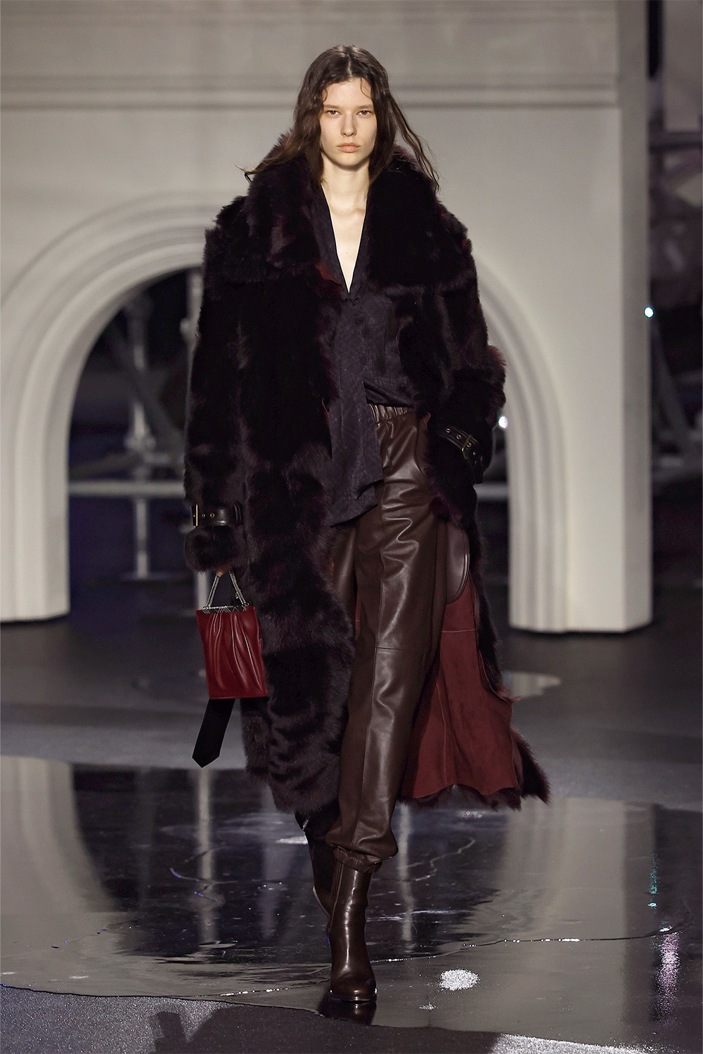 Отдельное внимание Burberry уделил тренчу, предложив сразу несколько направлений: от классических вариантов в светлых и глубоких темных оттенках до кожаных и клетчатых интерпретаций. В коллекции также были модели с рюшами, укороченные версии, варианты из шелка и овчины, а также более формальные решения в шерсти и эффектные версии с декоративной отделкой.
