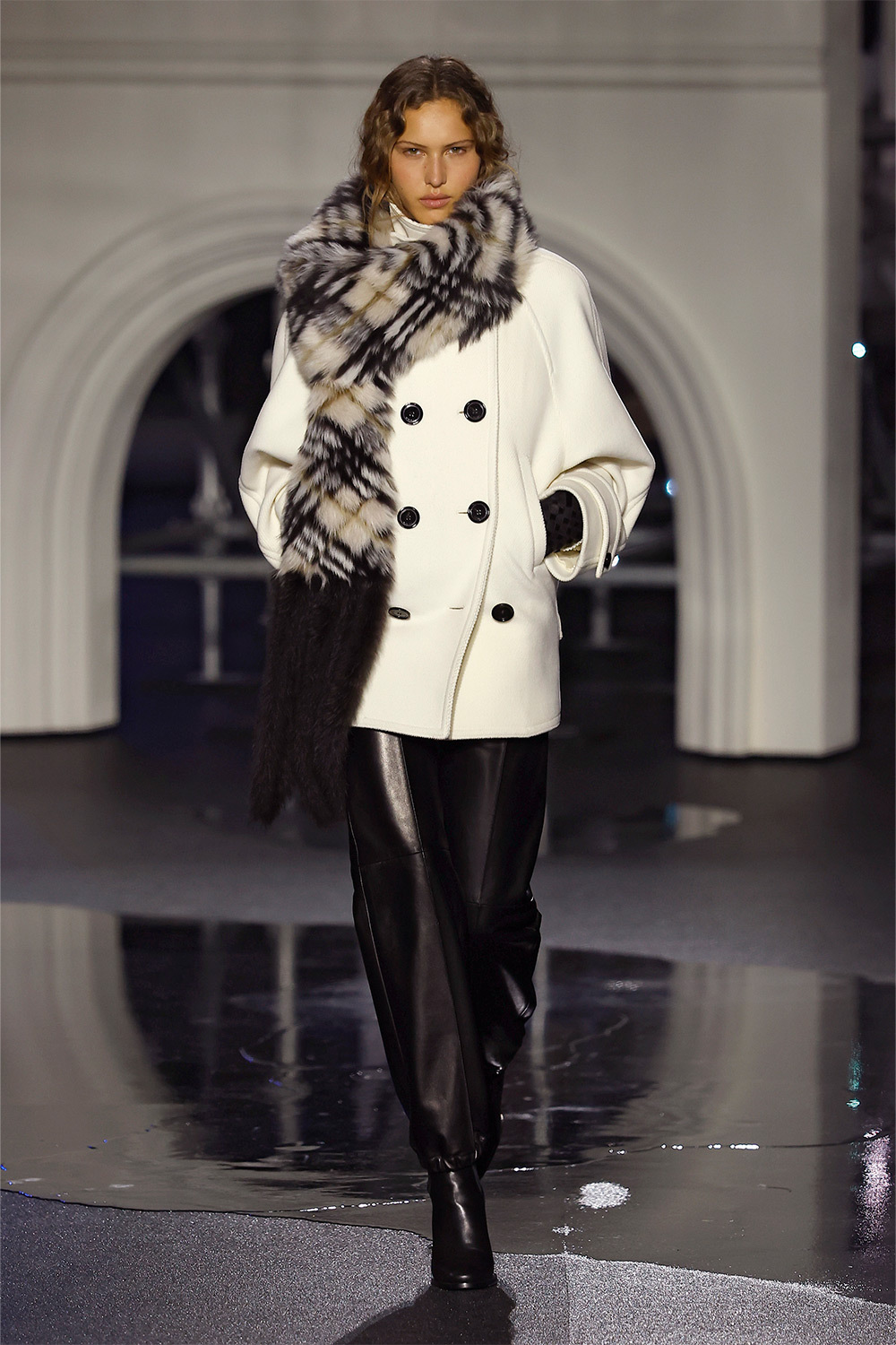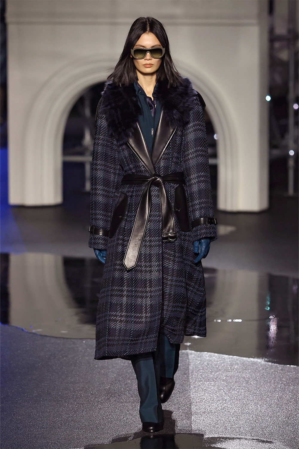 Коллекция осень–зима 2026 стала новым этапом этой линии. Даниэл Ли сделал акцент на эстетике зимней ночной жизни столицы и выстроил шоу вокруг узнаваемых кодов марки — клетки и тренча — но подал их в более графичном и «городском» ключе.