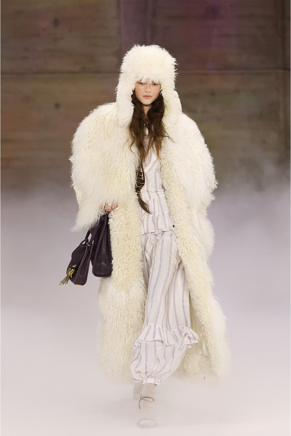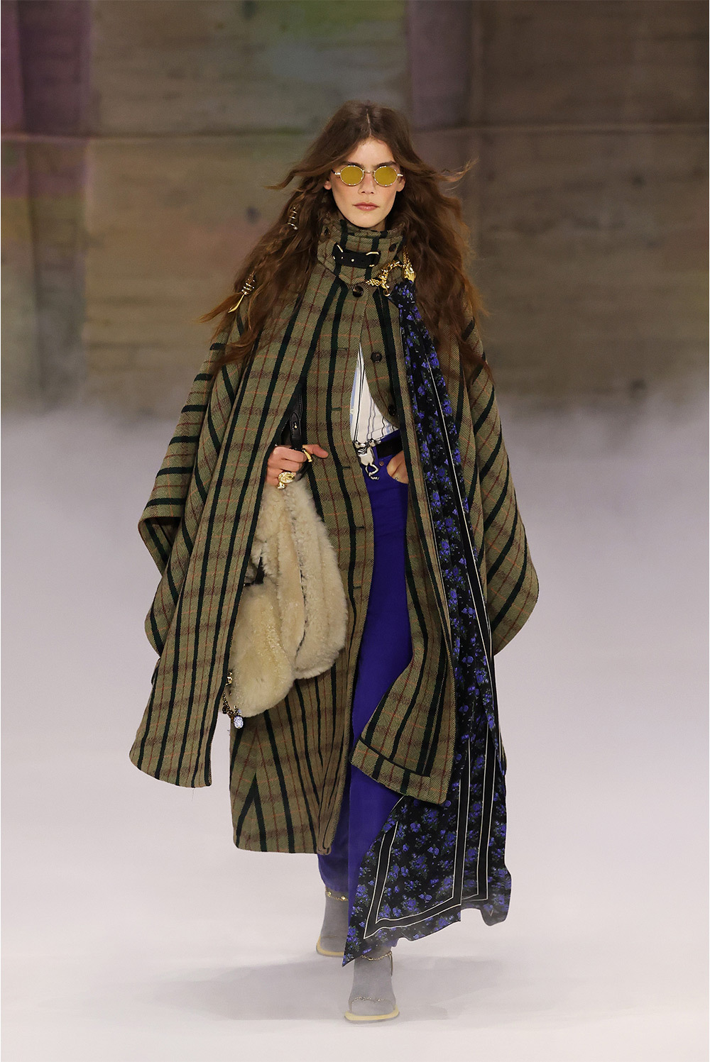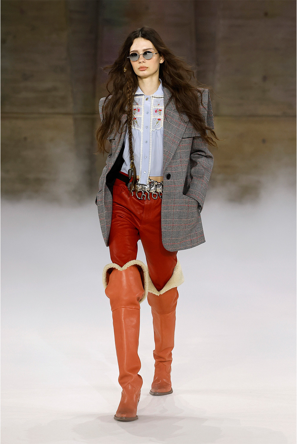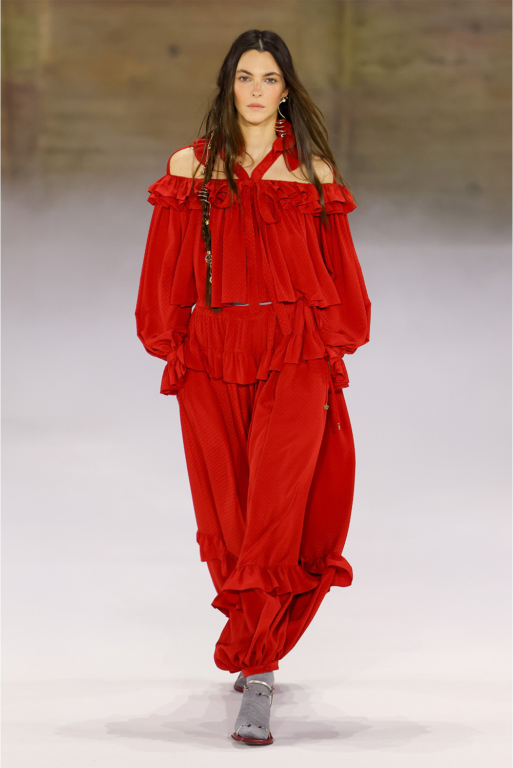 Главная отличительная черта сезона — отказ от привычного дому прямолинейного бохо в пользу резких плеч, узких брюк с низкой посадкой и скульптурных пальто с воротником-воронкой. Именно пальто с воротником-воронкой, шарообразные рукава и узкие брюки, собранные у щиколотки, уже окончательно читаются как подпись Камали в Chloé.