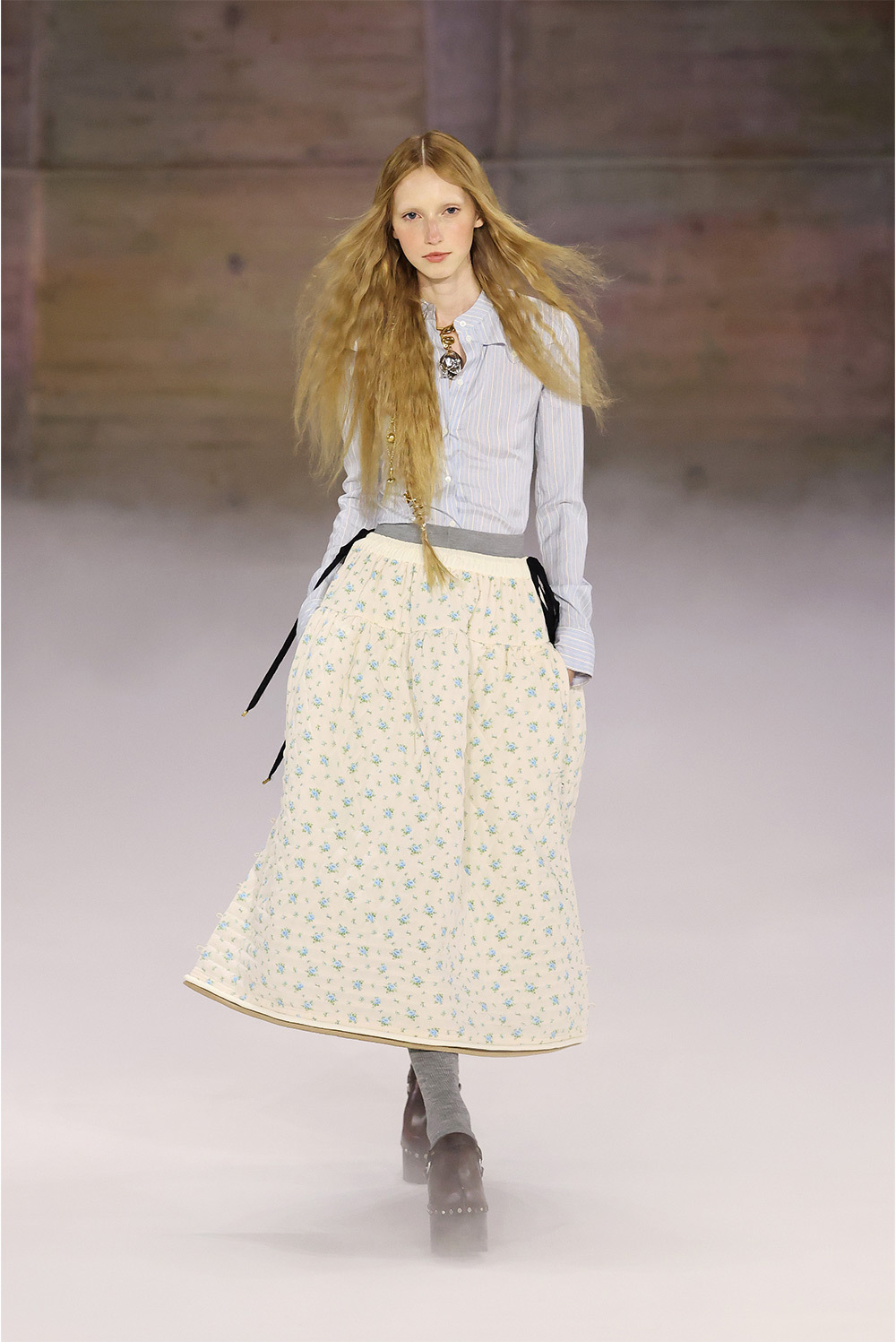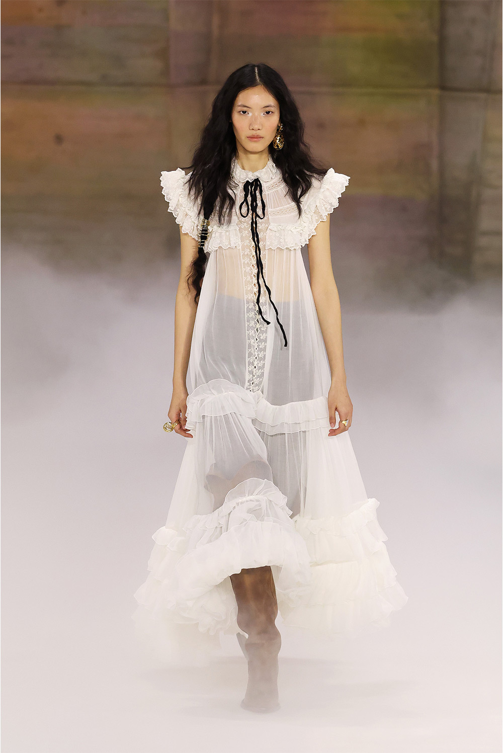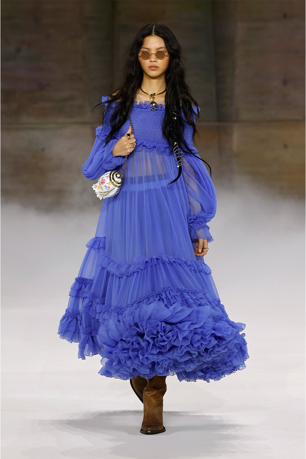 При этом цветочные принты, драпировки и многослойность остаются и выглядят свежо на контрасте с массивными кожаными ремнями и другими жесткими деталями, которые работают как архитектурные акценты, меняющие пропорции силуэта.