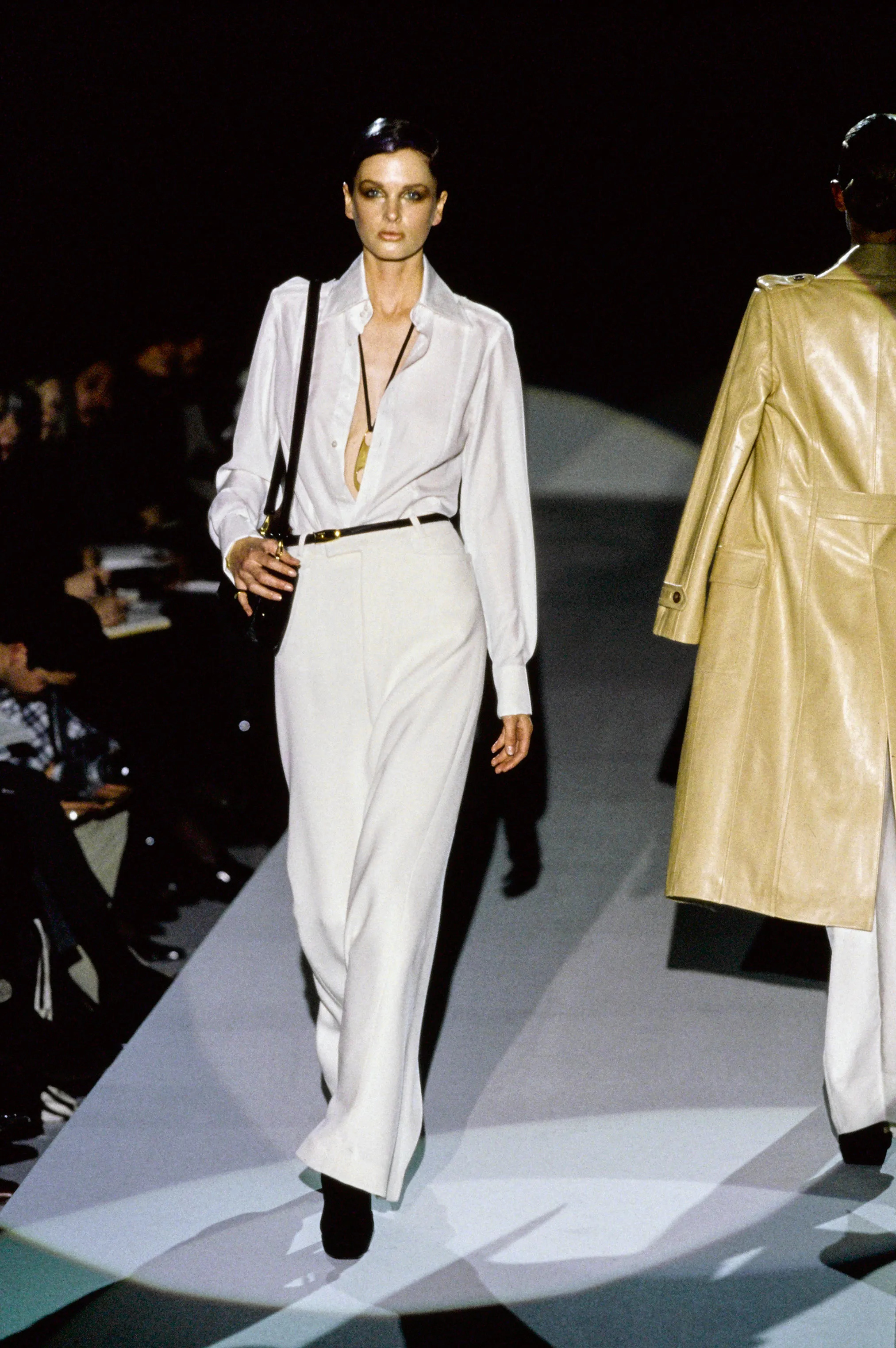 Ровно тридцать лет назад после нескольких довольно пуританских коллекций для Gucci Том Форд представил откровенные для своего времени образы: блузы, расстегнутые на три-четыре пуговицы, облегающие бедра брюки и платья из тонкого джерси, не предполагавшие нижнего белья. Это было воспринято как сексуальная революция в моде, а Тома Форда назначили ее предводителем, что было не вполне верно. Он лишь выразил то, что уже витало в воздухе, но не находило зримого воплощения. После десятилетия страха перед СПИДом, когда секс ассоциировался с опасностью, на рубеже 1980-90-х в моде царили депрессивный бесформенный гранж и асексуальный минимализм. Угроза заболеть никуда не исчезла, однако появилась более эффективная ВИЧ-терапия, и мир словно начал заново открывать для себя секс. В 1990 году Мадонна отправилась в турне в знаменитом бюстье с остроконечными чашками работы Жан-Поля Готье; в 1992-м Версаче показал платья-бондажи, вдохновленные БДСМ, а Тьерри Мюглер сделал популярными виниловые леггинсы, корсеты и байкерские куртки на голое тело. Но то были независимые дизайнерские бренды. Том Форд же стал первым, кто, придя в ультрабуржуазный дом Gucci, предложил сексуализированный образ столь же буржуазной его клиентке. Растрепанные прически «после секса» в коллекции осень-зима 1995/96 сменили безупречные пучки (лето 1996) – словно успешные женщины только вышли с заседания совета директоров, и времени у них в обрез – лишь на кофе и адюльтер, после чего еще нужно вернутся в офис. Облегающие платья тут соседствовали с костюмами, и это был женский «властный костюм» (women's power suit). Женщины Форда были сексуальны и субъектны.