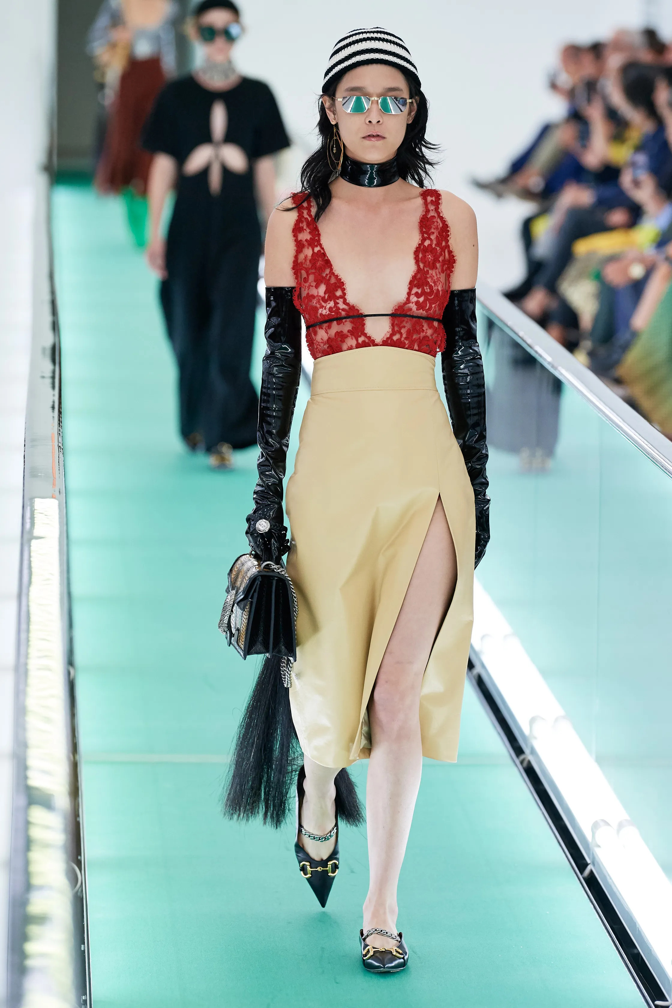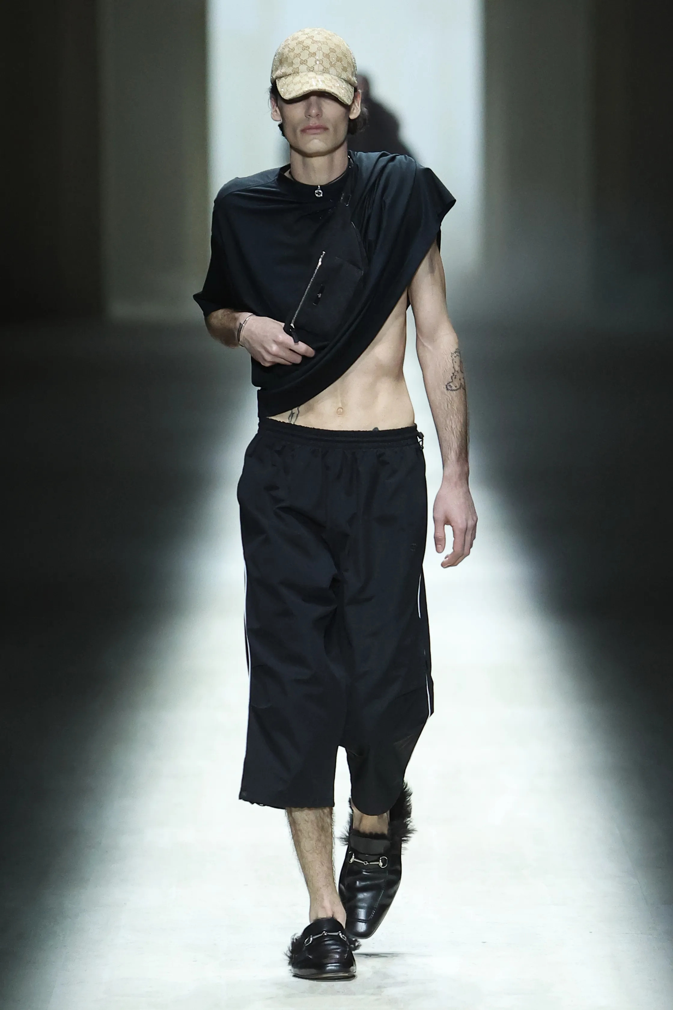 Моделей на последнем показе Gucci можно было лишь пожалеть. Они не шли по подиуму, а едва переставляли ноги на каблуках, шатаясь из стороны в сторону. Наверняка это было задумкой дизайнера, поскольку невозможно допустить мысли, что у Gucci с собственным производством обуви могут быть неудобные туфли. Часть девушек в облегающих мини-платьях, выглядели так, словно секс им действительно интересен, но исключительно в профессиональном плане. Прочие же словно только что вышли из клуба, где им что-то подмешали в коктейль, и ничем хорошим эта ночь явно не закончится. Одним словом, они выглядели так, словно секс не был их добровольным выбором. Мужские образы – а это преимущественно плотно сидящие брюки и футболки словно из спандекса, облегающие мускулы, и накидки на одно плечо, напоминающие обрезанную римскую тогу, – также были подчеркнуто сексуализированными. Поскольку массовое сознание переключилось на объективацию мужчин, о чем говорит популярность сериала «Жаркое соперничество», эти образы ничего, кроме дежа вю, не вызывали. В целом эта коллекция казалась таким же пастишем, копией копии, как и декорации показа – древнеримские статуи, напечатанные на 3D-принтере.