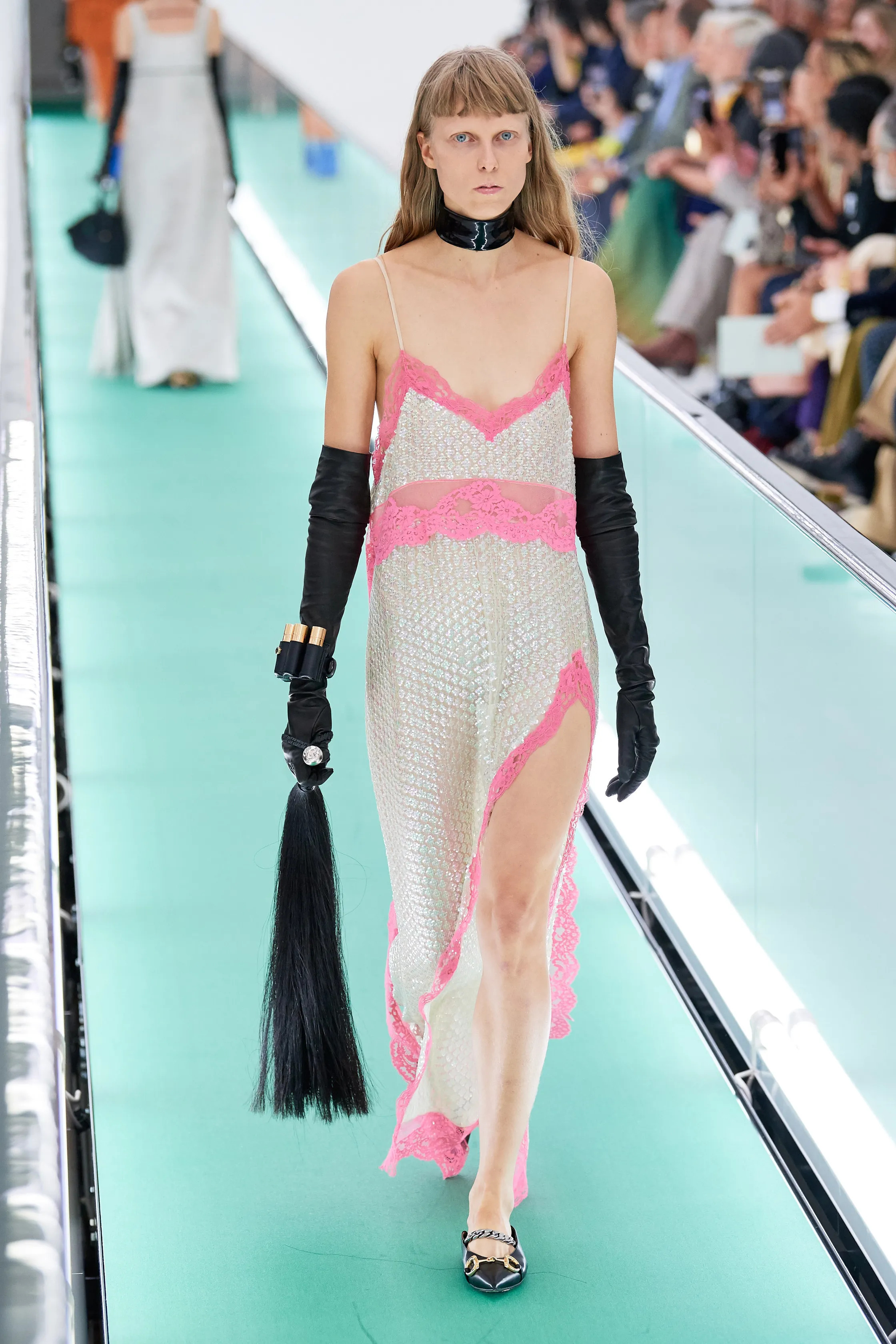 Пожалуй, единственным по-настоящему авторским его приемом можно считать обращение к культуре окраин. Рэпер Fakemink и еще несколько моделей изображали маргиналов в остроносых туфлях и с поясными сумками с монограммами GG, надетыми через плечо, которые продаются на каждом вещевом рынке. Вопрос в том, насколько эта ирония нужна сегодня Gucci – бренду, суть которого идеально выразила Патриция Реджани, супруга Маурицио Гуччи, заказавшая его убийство: «Лучше плакать в Роллс-Ройсе, чем смеяться на велосипеде». Однако спустя годы «Роллс-Ройс» испарился, остались лишь G-стринги (впрочем, с бриллиантами за 95 тысяч евро), в которых (и платье в пайетках с открытой спиной) закрывала показ Кейт Мосс. Так было и в годы Тома Форда, но от былой живости и свежести лица не осталось и следа. Спокойной походкой, отягощенная грузом лет, она прошла по подиуму, недвусмысленно давая понять: вечеринка закончилась. Выжили только супермодели.