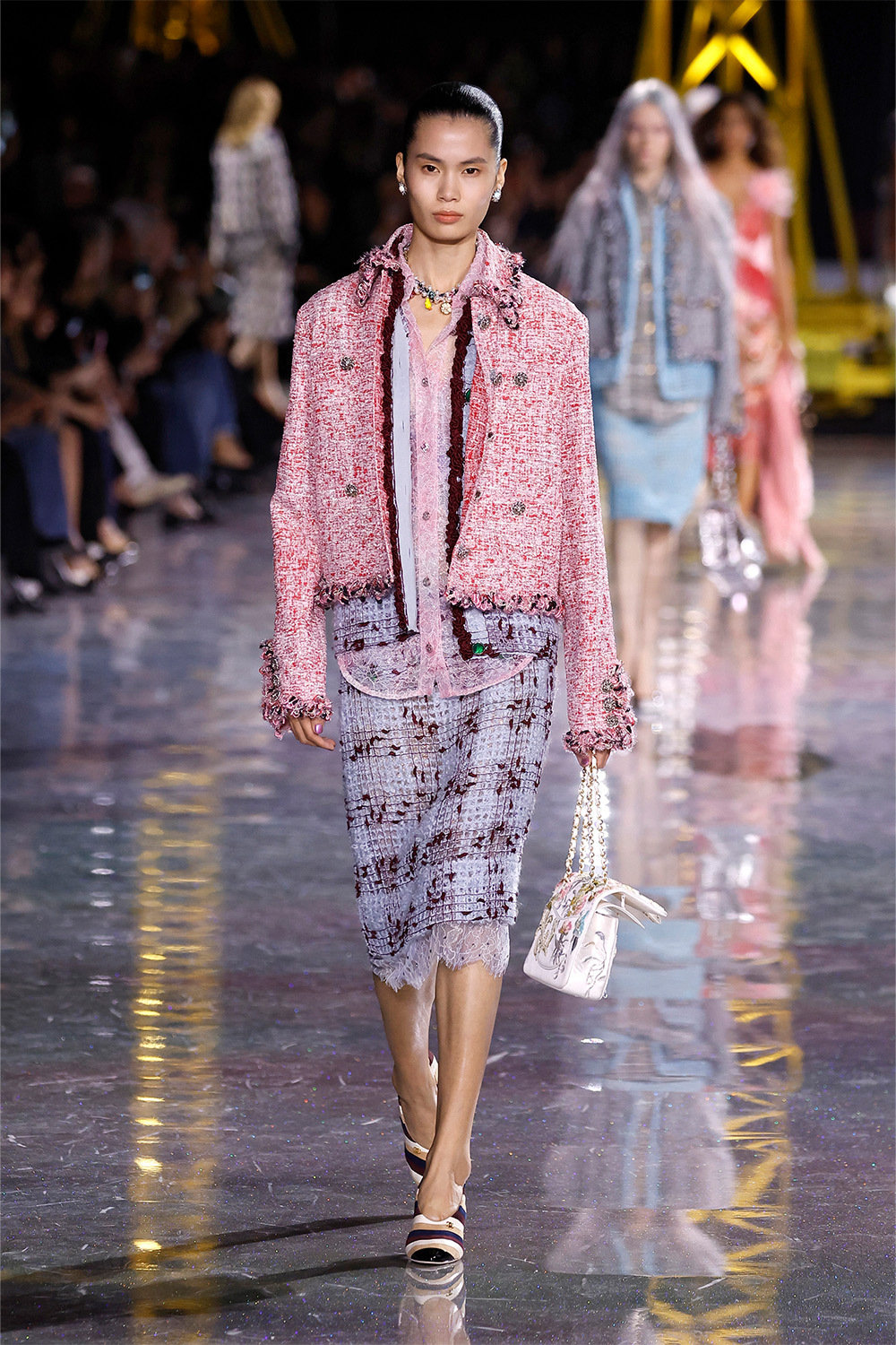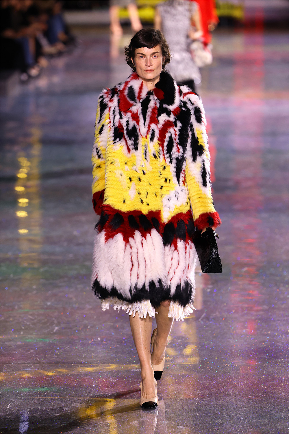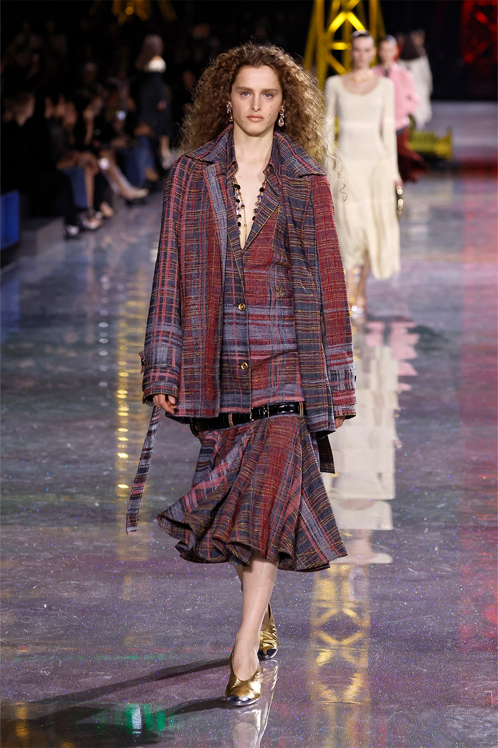 Твидовые костюмы соседствуют с плиссированными юбками на низкой посадке, цветочными принтами и яркими шубами. Дизайнер переосмысливает наследие Коко Шанель, адаптируя формы платьев и жакетов к современным реалиям. Тут же — летящие полосатые платья, жакеты с нашитыми цветами, «мохнатая» обувь и новые версии классических сумок.