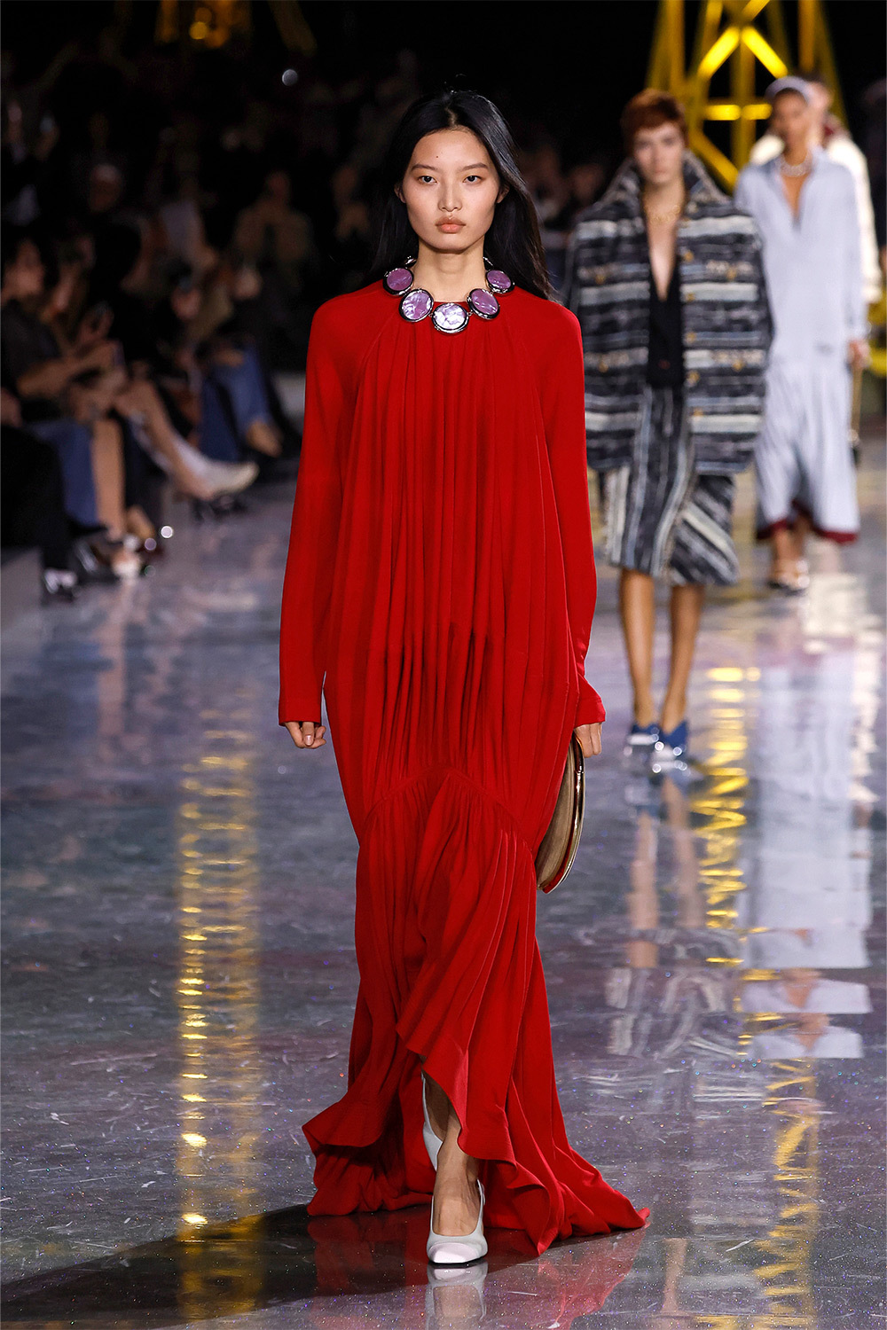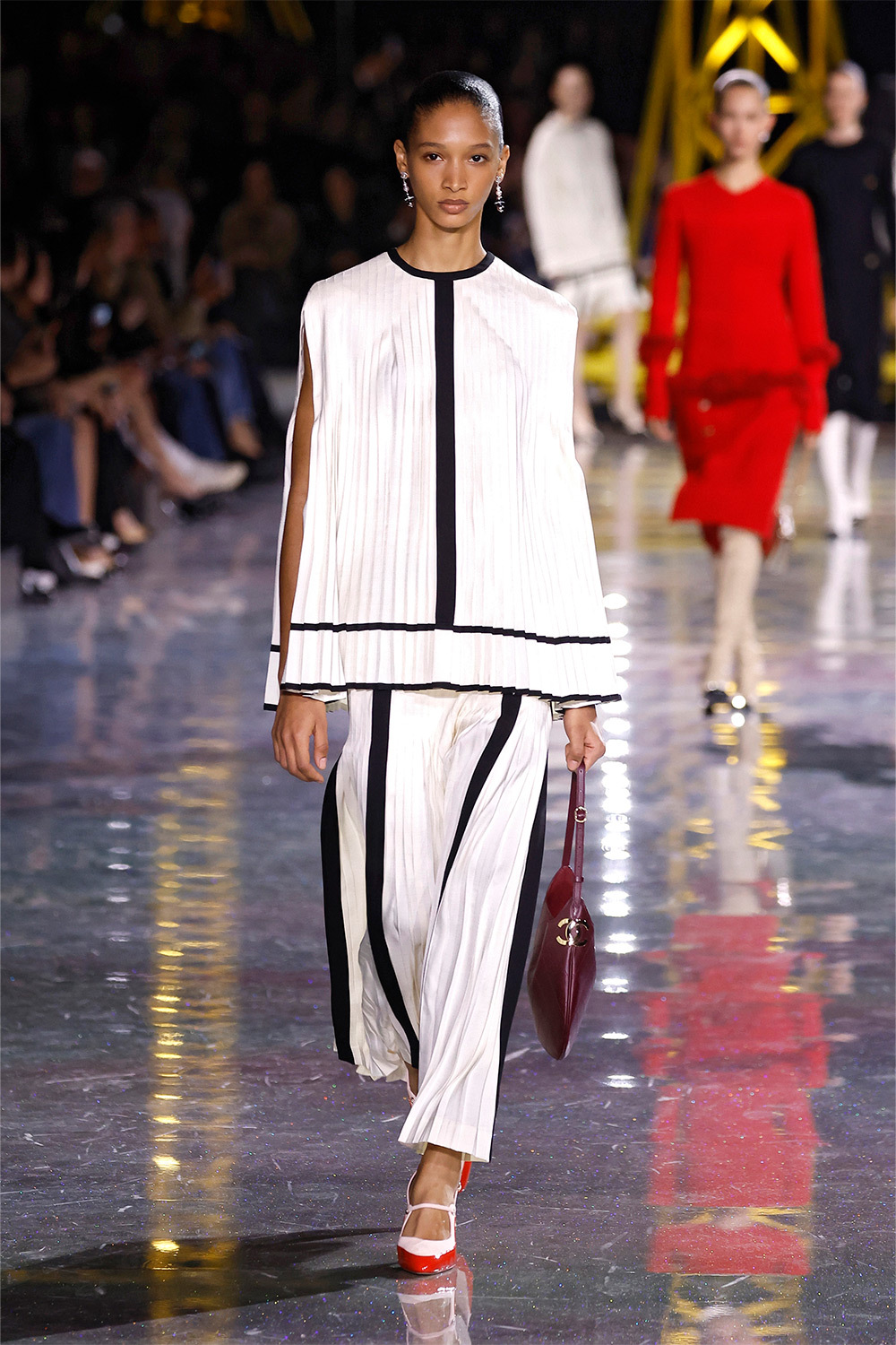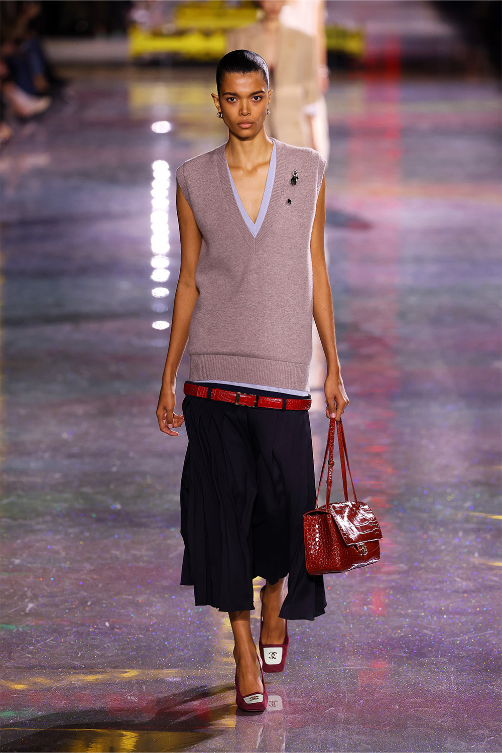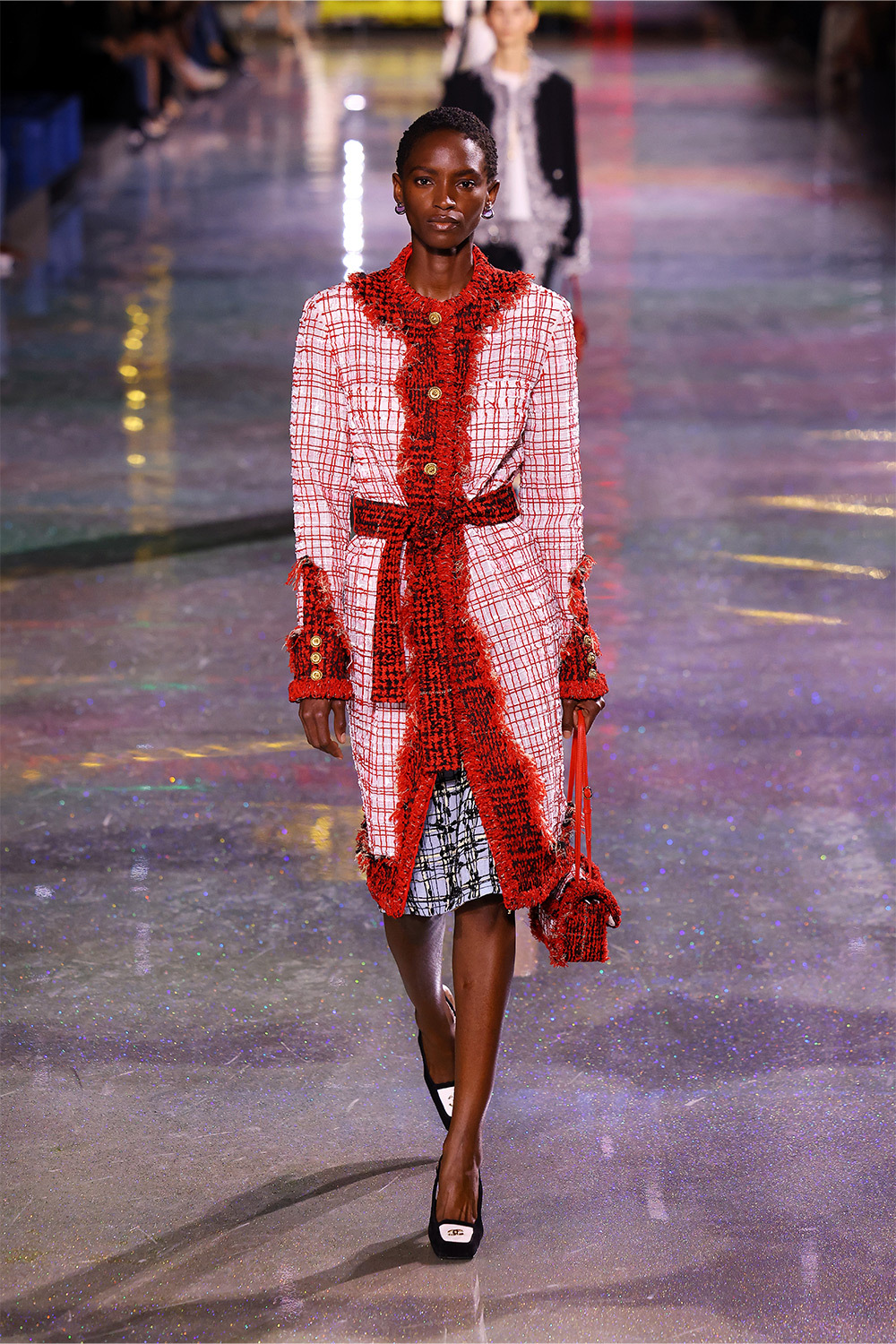 Твидовые костюмы соседствуют с плиссированными юбками на низкой посадке, цветочными принтами и яркими шубами. Дизайнер переосмысливает наследие Коко Шанель, адаптируя формы платьев и жакетов к современным реалиям. Тут же — летящие полосатые платья, жакеты с нашитыми цветами, «мохнатая» обувь и новые версии классических сумок.