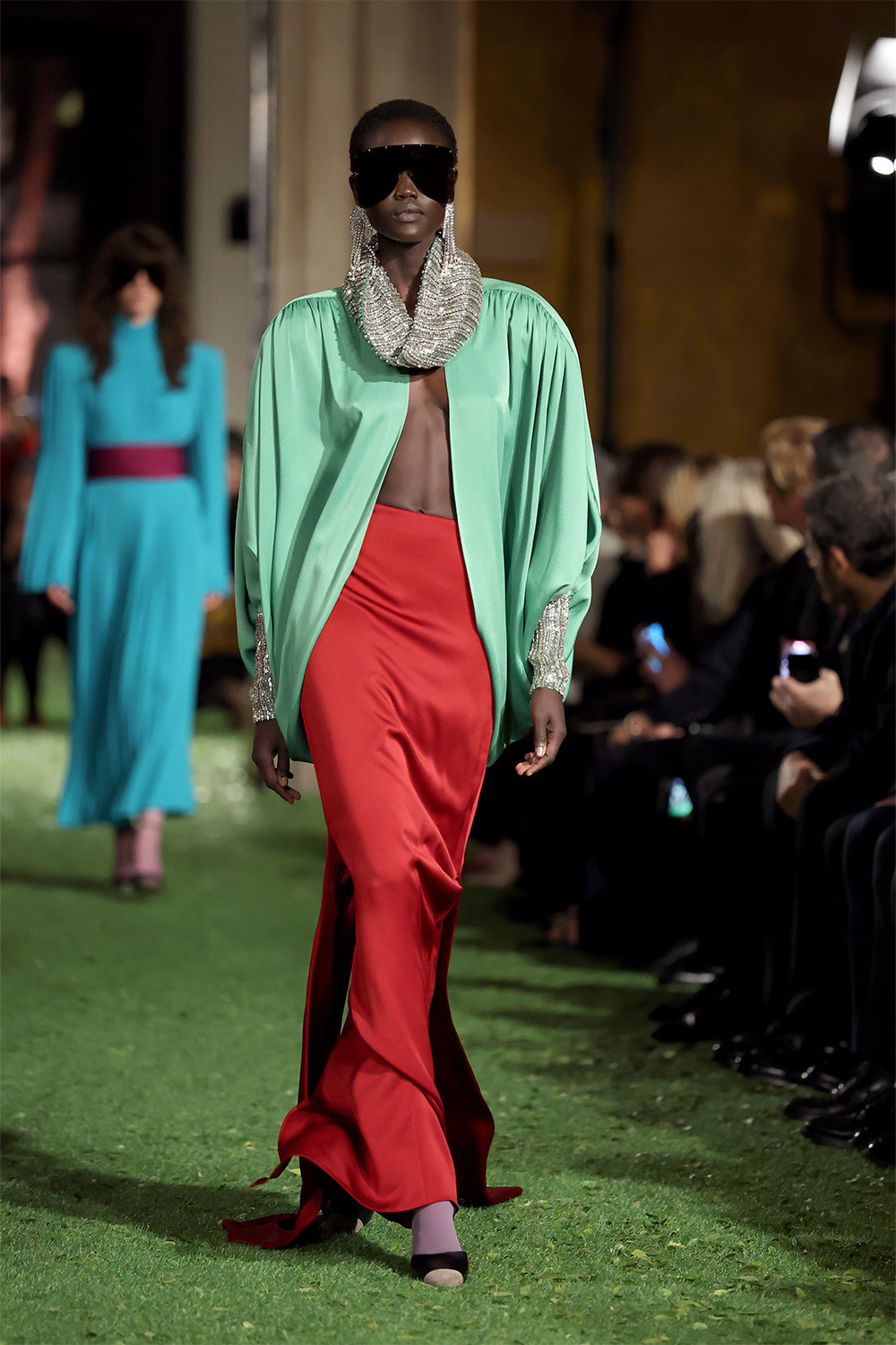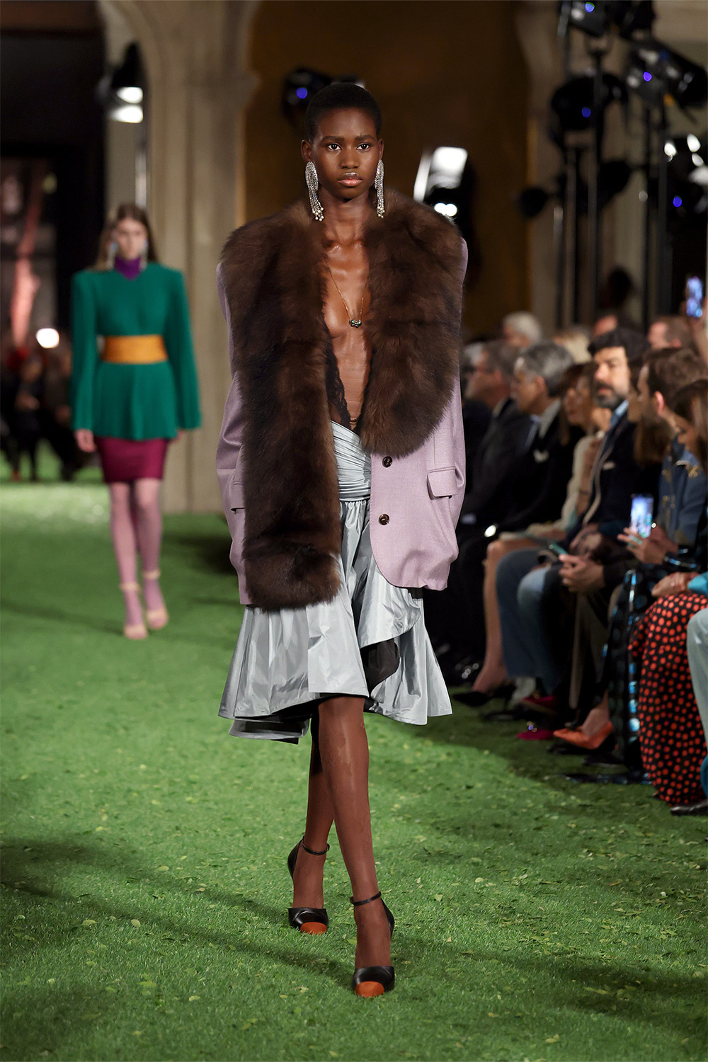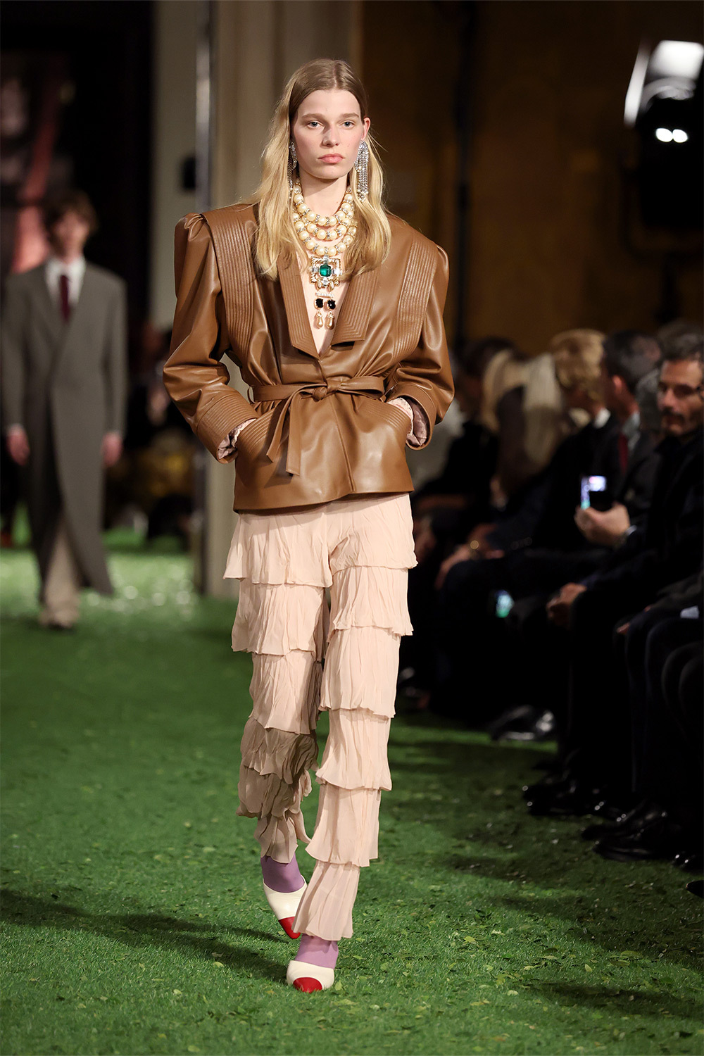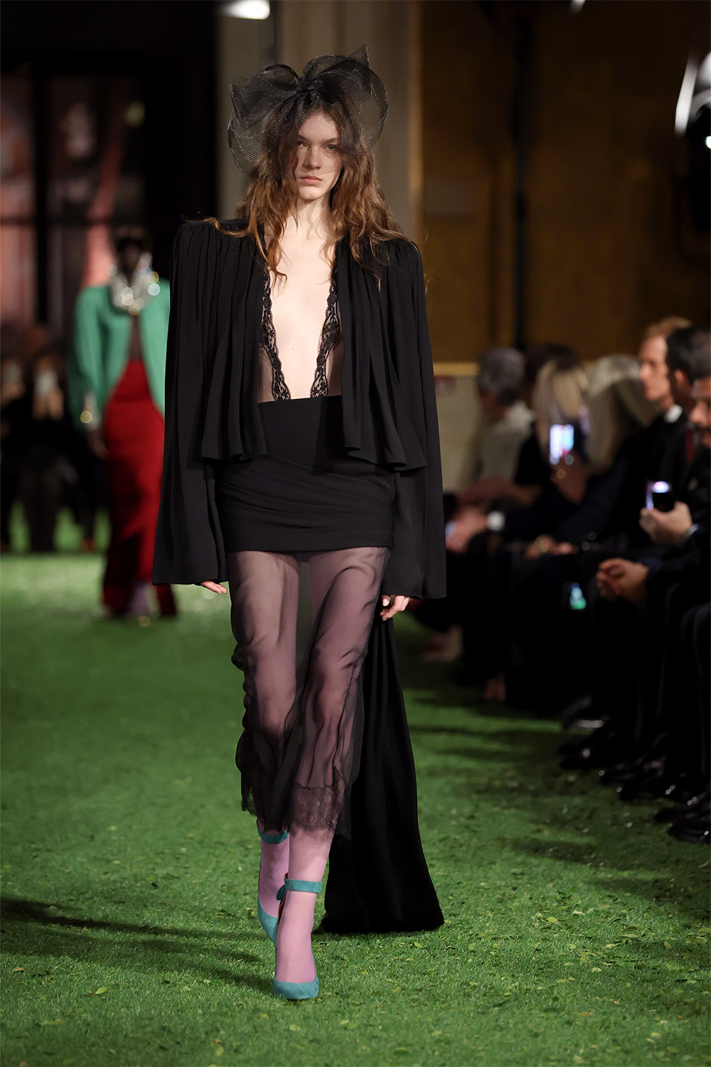 У Valentino она проявляется в столкновении стилей, гендерных границ и исторических отсылок. Прозрачные шифоновые платья с металлическим блеском и асимметричными драпировками поверх строгих корсетов, костюмы с асимметричными лацканами, где классический смокинг «накладывается» на уличные элементы вроде цепочек и массивных ботинок, или бархатные жакеты с орнаментами, вдохновлёнными фресками Кортоны.