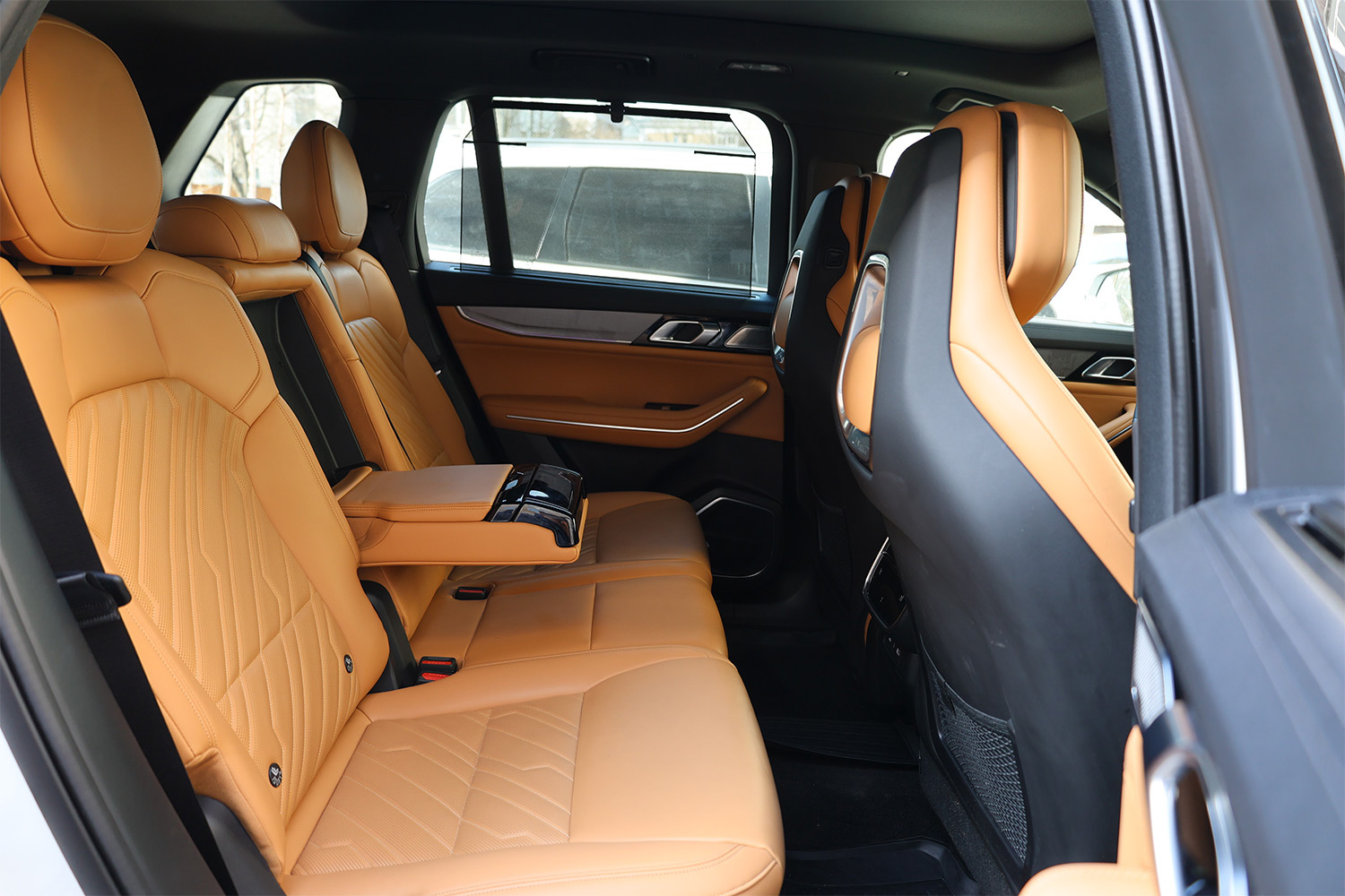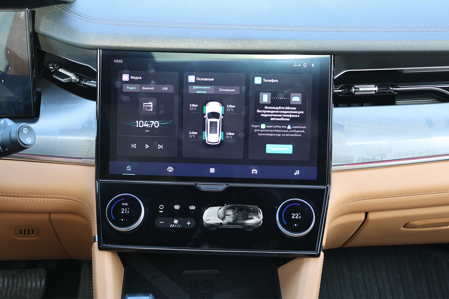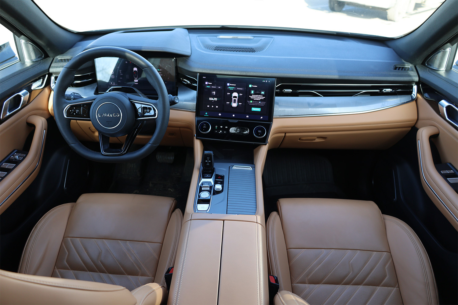 В салоне давно забытые натуральные материалы: кожа наппа на сиденьях и алюминий на передней панели и дверях. Форма кресел указывает на тесное сотрудничество китайских и шведских инженеров, которые разрабатывали кроссовер для людей самой разной комплекции. У сидений первого и второго рядов есть подогрев и вентиляция. Дополнительно у сидящих спереди есть функция массажа, а персонально для водителя предусмотрены регулируемые по ширине валики боковой поддержки и регулировка длины подушки. Рулевая колонка также имеет электрорегулировку.