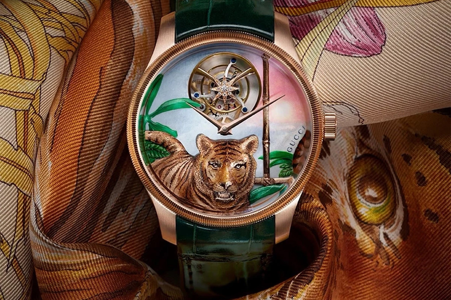 Корпус диаметром 40 мм выполнен из белого или розового золота, с турбийоном, украшенным бриллиантами, и гравированной задней крышкой. Циферблат превращен в миниатюрное полотно ручной работы: перьевая инкрустация, оникс, опал, яшма, перламутр, микро-маркетри и тонкая ручная роспись. Четыре варианта оформления обыгрывают флоральные и анималистические мотивы из архивных принтов Gucci. Две модели созданы в коллаборации с французской художницей по перьям Нелли Сонье.