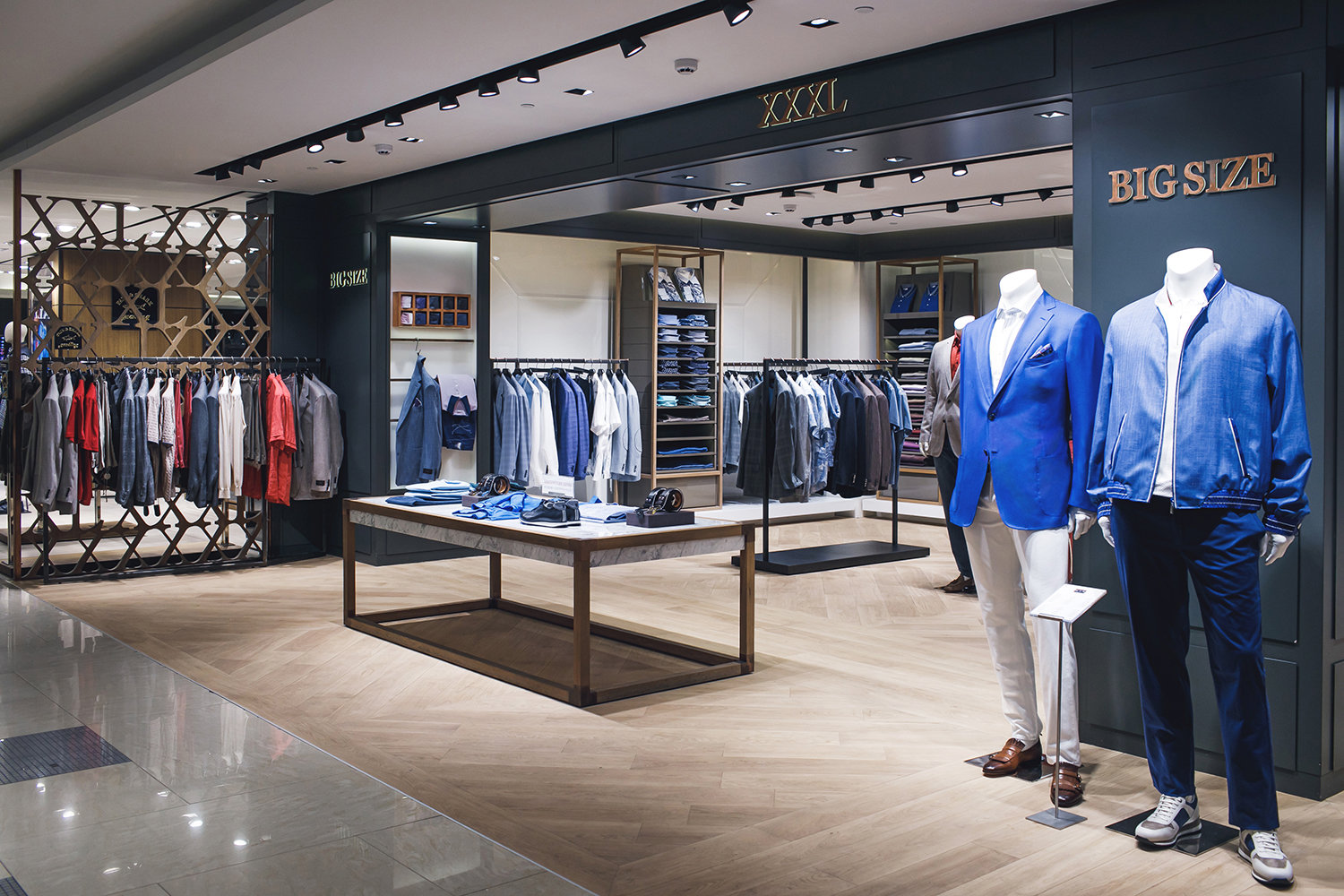 О бновленный корнер мужской одежды XXXL работает на втором этаже ЦУМа. Здесь, на площади 160 кв. м, представлены костюмы, сорочки, пальто, поло, джинсы, кардиганы от 60 до 70 размера. Среди брендов – Brioni, Zilli, Pal Zileri и др. Также в магазине можно приобрести обувь от 46 до 50 размера.