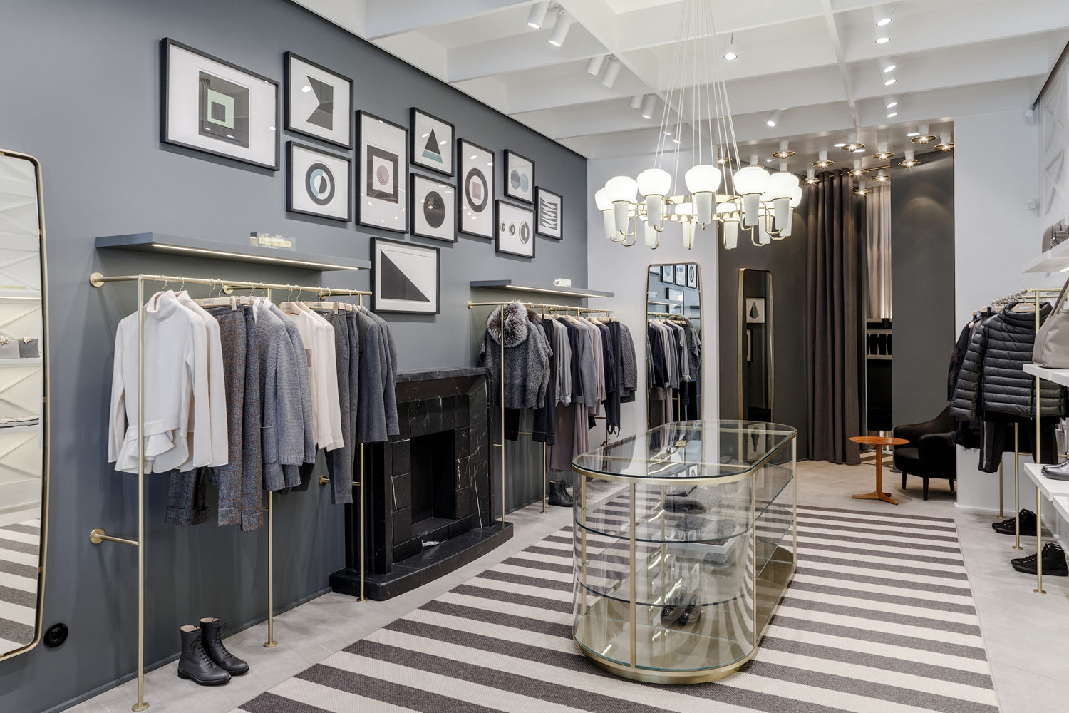 К этому же периоду относятся и кофейные столики из красного дерева и ореха, созданные в студии Kerstin Horlin-Holmquist. Особое внимание уделено освещению: здесь есть латунные люстры Hans Agne Jacobsson, а также светильники Джозефа Франка, произведенные на фабрике Svenskt Tenn. В пространстве бутика разместился и камин из черного мрамора, спроектированный архитектором Николой Квадри специально для Fabiana Filippi. За основу дизайна камина взята работа прославленного итальянского архитектора Джо Понти.