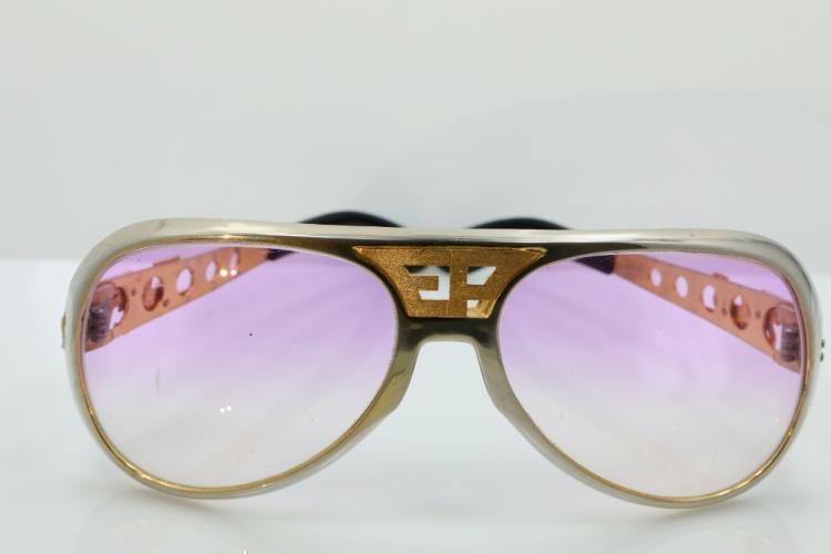 Солнцезащитные очки с тонированным стеклами, некогда принадлежавшие королю рок-н-ролла, выполнены из пластика и дополнены элементами из хрома.