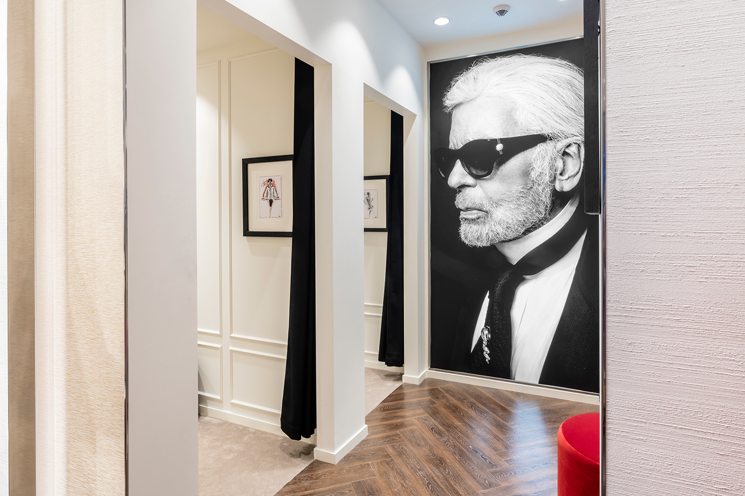 Дизайн магазина вдохновлен интерьером дома и офиса Карла Лагерфельда — мрамор, латунь, эскизы на стенах, ковер точно такие же, как и в квартире самого дизайнера. Стулья из красного бархата и деревянные полы были вдохновлены антикварной мебелью и традиционной французской архитектурой.