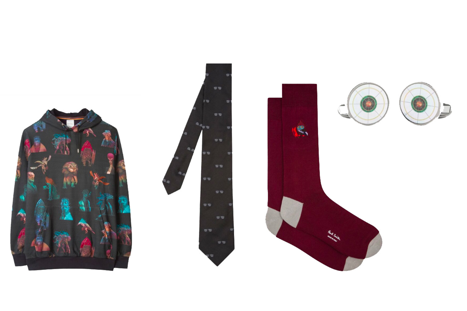 В дополнение к костюмам в коллекции большое разнообразие аксессуаров с узнаваемым дизайном Paul Smith в сочетании с легендами франшизы: черный галстук с рисунком солнечных очков, платок и шарф с узором в виде инопланетных героев, зажим для денег, носки в насыщенных цветах с вышивкой, кожаный бумажник и чехол для iPhone.
