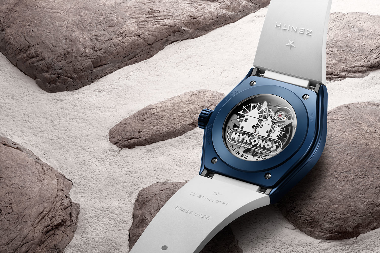 Швейцарский часовой бренд Zenith создал особую модель часов Defy Classic Mykonos Edition, которая посвящена этому греческому острову. Классический корпус Defy Classic диаметром 41 миллиметр создан из высоко прочной керамики глубокого синего цвета, частично матовой, частично полированной, что усиливает и без того футуристический облик часов. Синий цвет, разумеется, выбран не случайно – это одновременни и цвет Эгейского моря, которое омывает остров, и один из цветов греческого флага. Второй цвет греческого флага демонстрирует белый металл стрелок и деталей скелетонизированного циферблата и нижний слой ремешка из белого каучука. При этом верхняя часть ремешка часов решен авесьма оригинально: его основная поверхность из синего каучука имитирует булыжники, которые повсеместно встречаются на пляжах Миконоса и на мостовых узких улочек острова.