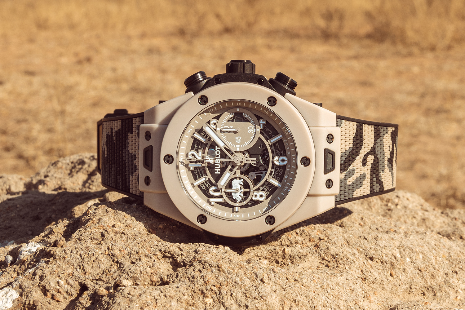 100 первых экземпляров часов Big Bang Unico SORAI – это модель в 45-мм корпусе с безелем и циферблатом в характерных тонах песков и кустарников Африки. На отметке «9 часов» на счетчике хронографа можно видеть изображение носорога, исполненное в технике мозаики в белом цвете, а NATO-браслет изготовлен из ткани камуфляжной расцветки.