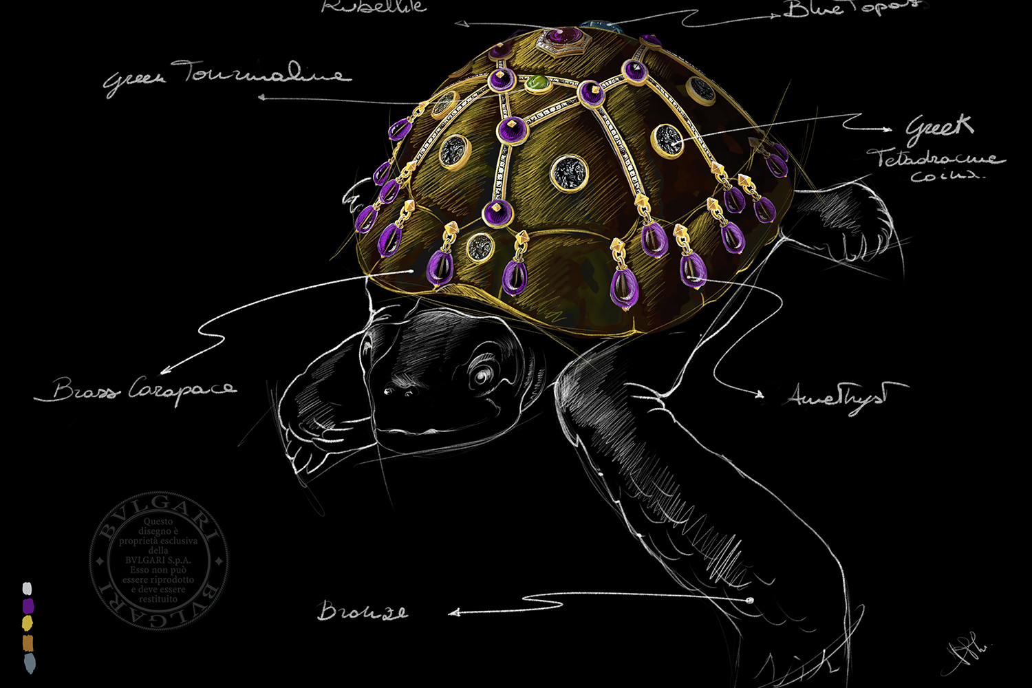 Богатое воображение Веццоли и присущее Bvlgari владение цветом и формой идеально дополняют друг друга: полированный панцирь черепахи декорирован аметистами и кабошонами рубеллита, цитрина, перидота и топаза (всего 43 камня совокупным весом в приблизительно 1500 карат) и девятью древнегреческими серебряными монетами. Бриллиантовый паваж подсвечивает перегородки панциря, подчеркивая контраст с грубыми контурами остальной части тела животного, выполненными из бронзы. Мастерам Bvlgari потребовалось 530 часов, чтобы установить камни и монеты и превратить панцирь в этот ювелирный объект.
