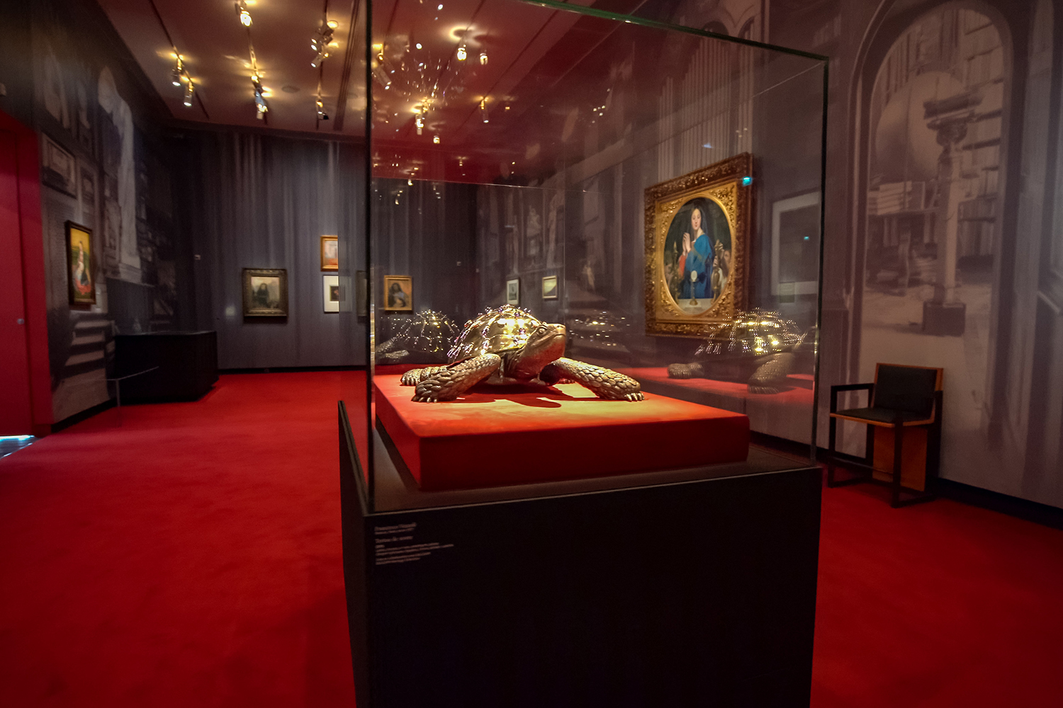 Произведение искусства под названием Tortue de Soiree («Вечерняя Черепаха») представляет собой гигантскую черепаху, чей латунный панцирь украшен драгоценными камнями. На ее создание художника вдохновил роман Жориса-Карла Гюисманса «Наоборот», его главный герой Жан дез Эссент скрывается от лицемерия и условностей общества в уединенном особняке, где занят тем, что потакает своим желаниям, гедонизму и безудержному эстетству. Он окружает себя предметами, книгами и мебелью, отражающими его вкус, в их числе – и домашняя черепашка, чей панцирь он украшает сияющими камнями, чтобы она соответствовала его тонкому чувству стиля.