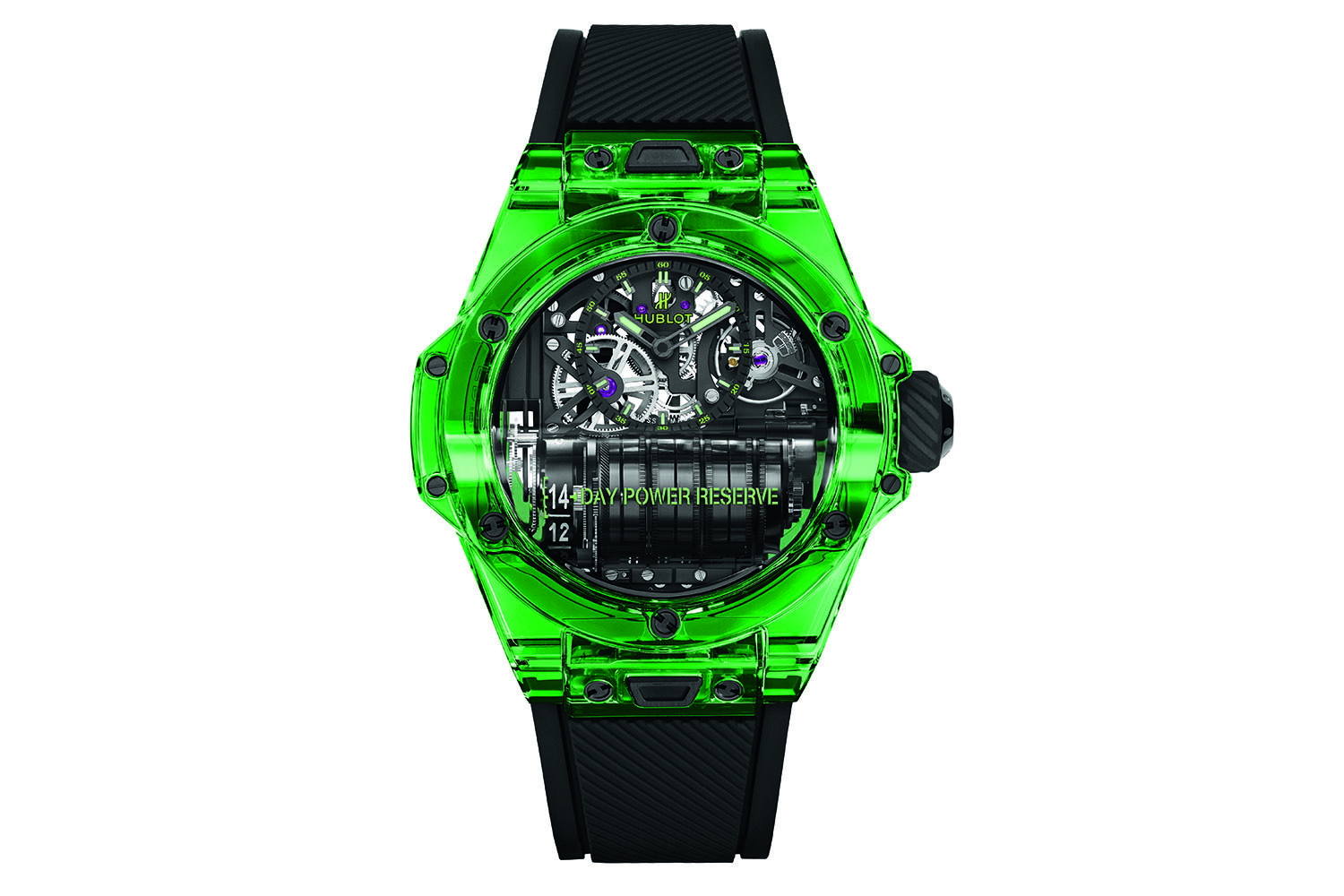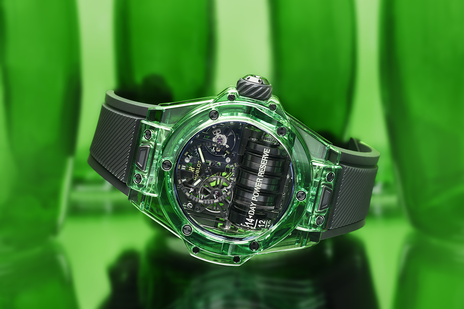 Корпусу часов было решено придать глубокий изумрудный оттенок, благодаря которому корпус часов может поспорить с настоящим драгоценным камнем. Под прозрачным изумрудным корпусом бьется мануфактурный калибр HUB9011 из 270 компонентов с авто-подзаводом с внушительным запасом хода в 14 дней, который обеспечивают семь барабанов, просматриваемых в нижней части циферблата. Предыдущие версии модели Hublot Big Bang MP-11 были созданы в корпусе из сапфирового стекла и из карбона.