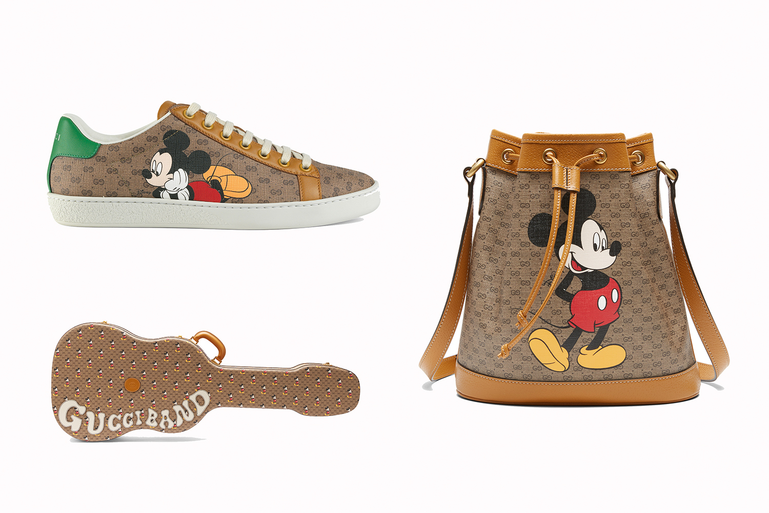 Коллекция Disney x Gucci Chinese New Year выполнена в винтажном стиле и включает в себя различные аксессуары – от обуви и сумок до кошельков и шарфов. В этой капсуле впервые был использован материал Mini GG Supreme с принтом «Микки Маус». За основу взяли дизайн 80-х гг.