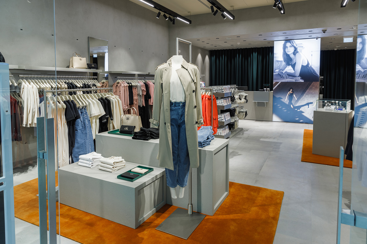Бутик американского бренда расположился в торговом центре «Метрополис». Интерьер магазина, занимающего 113 кв. м, создан из бетона и стекла, выполнен в сдержанной серой цветовой гамме в урбанистическом стиле. Ярким акцентом в оформлении стали оранжевые ковры и, собственно, сама одежда. Сейчас в пространстве бутика представлена мужская и женская коллекция Calvin Klein сезона весна-лето 2020, а также аксессуары.