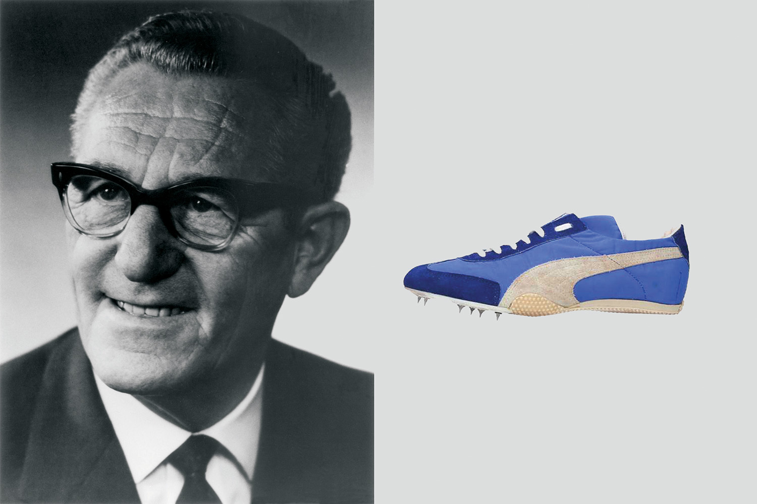 Рудольф Дасслер – основатель компании Puma. Справа – кроссовки 1976 года, модель Mirage