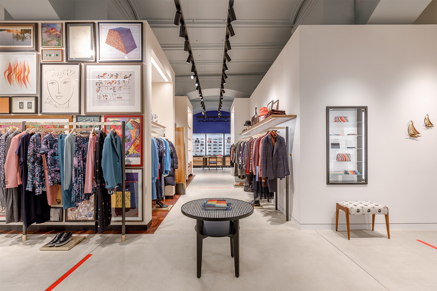 Мебель для магазина собирали по всему миру. Тут есть мозаичный стол 1950-х годов французского художника-керамиста Роджера Капрона и стол 1960-х годов голландского дизайнера Фрисо Крамера. Стальные стулья 1960-х годов были восстановлены и обшиты в Paul Smith тканью Maharam.