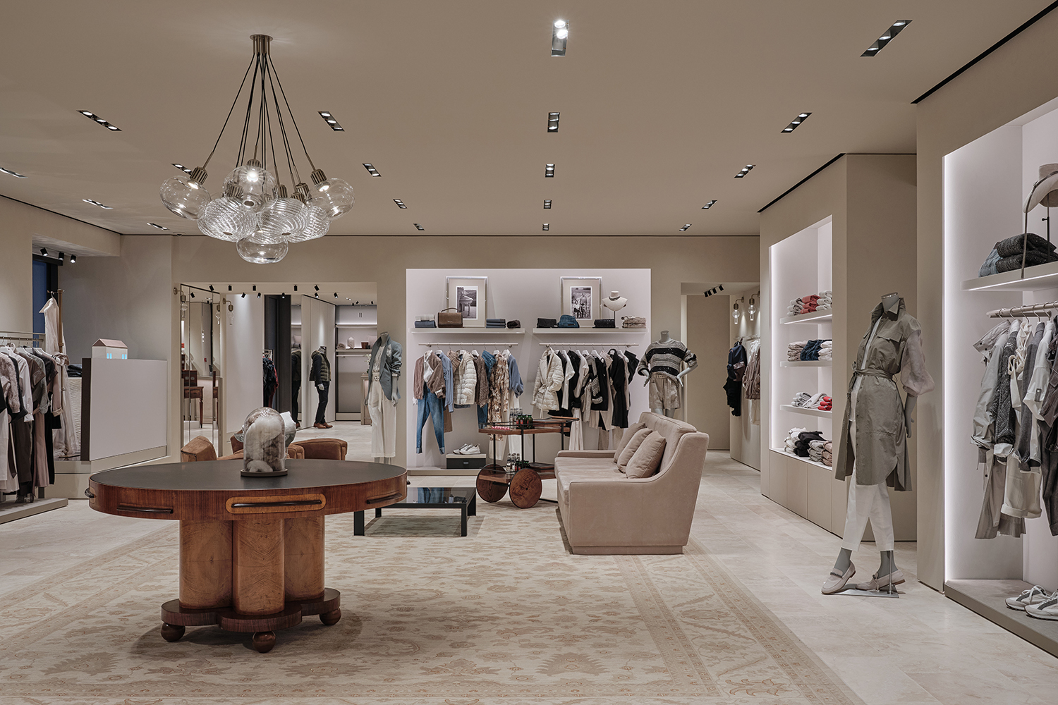 В бутике представлены не только мужская и женская коллекции, но и интерьерные линии. Также здесь обустроена зона, посвященная Sartoria Solomeo, где по запросу предоставляются услуги пошива одежды по индивидуальному заказу, и уютное внутреннее кафе.