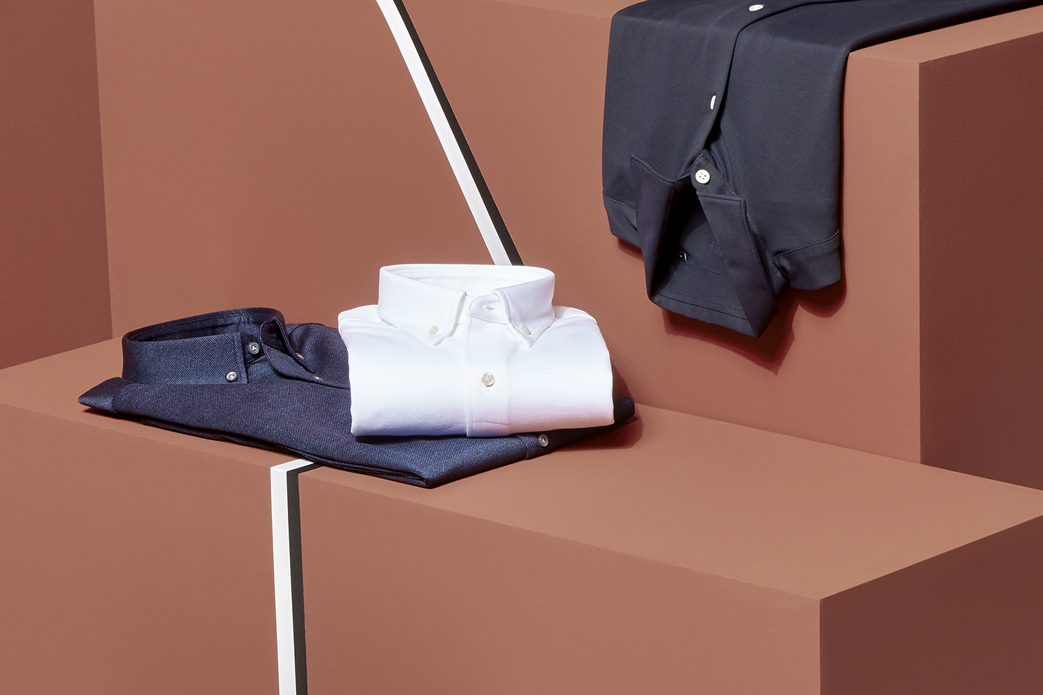В коллекцию вошли рубашки прямого и приталенного кроя различных оттенков белого и «правильного» голубого.