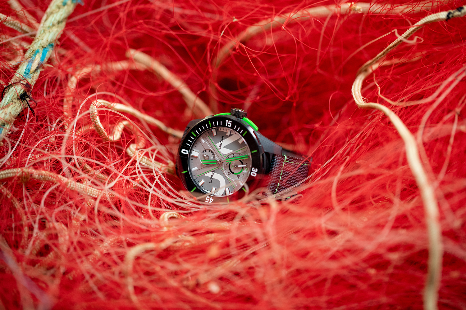Отделку корпуса 44 мм и промежуточного корпуса и задней крышки доверили Fil & Fab, первой во Франции компании по переработке рыболовных сетей в полиамид. Вогнутый инвертированный безель с односторонним механизмом вращения также изготовлен из этого материала, а ремешок часов – из полиэтиленового мусора, извлеченного из моря и переработанного швейцарской компанией Tide в мотки ниток.