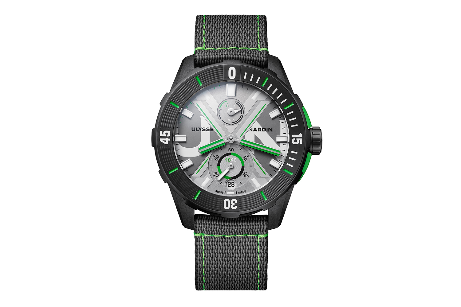Традиционное сапфировое стекло здесь заменено на прозрачное керамическое, обработка которого налажена в швейцарском кантоне Юра с минимальным воздействием на окружающую среду. Символизирующие чистую природу ярко-зеленые акценты присутствуют на сером циферблате с крупными белыми буквами, на безеле, защите заводной головки и в декоративных строчках браслета из переработанного полиэтилена. Работу индикатора запаса хода на отметке «12 часов», календаря и секундной стрелкой на отметке «6 часов» обеспечивает мануфактурный калибр UN-118 с кремниевыми компонентами.