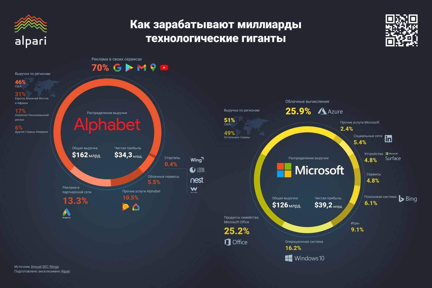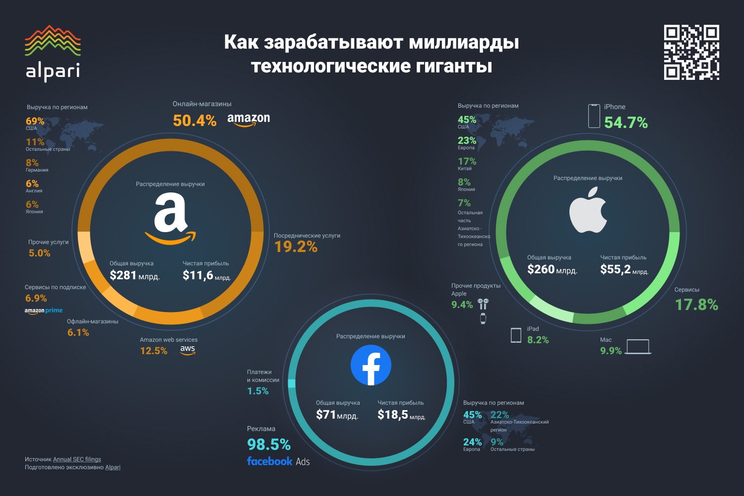 Основная статья дохода для Facebook и Alphabet (Google) – это продажа рекламы. Доля выручки от нее у Facebook составляет 98,5%, у Google – около 83%. Apple получает 82% выручки от реализации своих устройств (iPhone, Mac, iPad и других) и 18% от продажи услуг (Apple Pay, Apple TV, Apple Music).