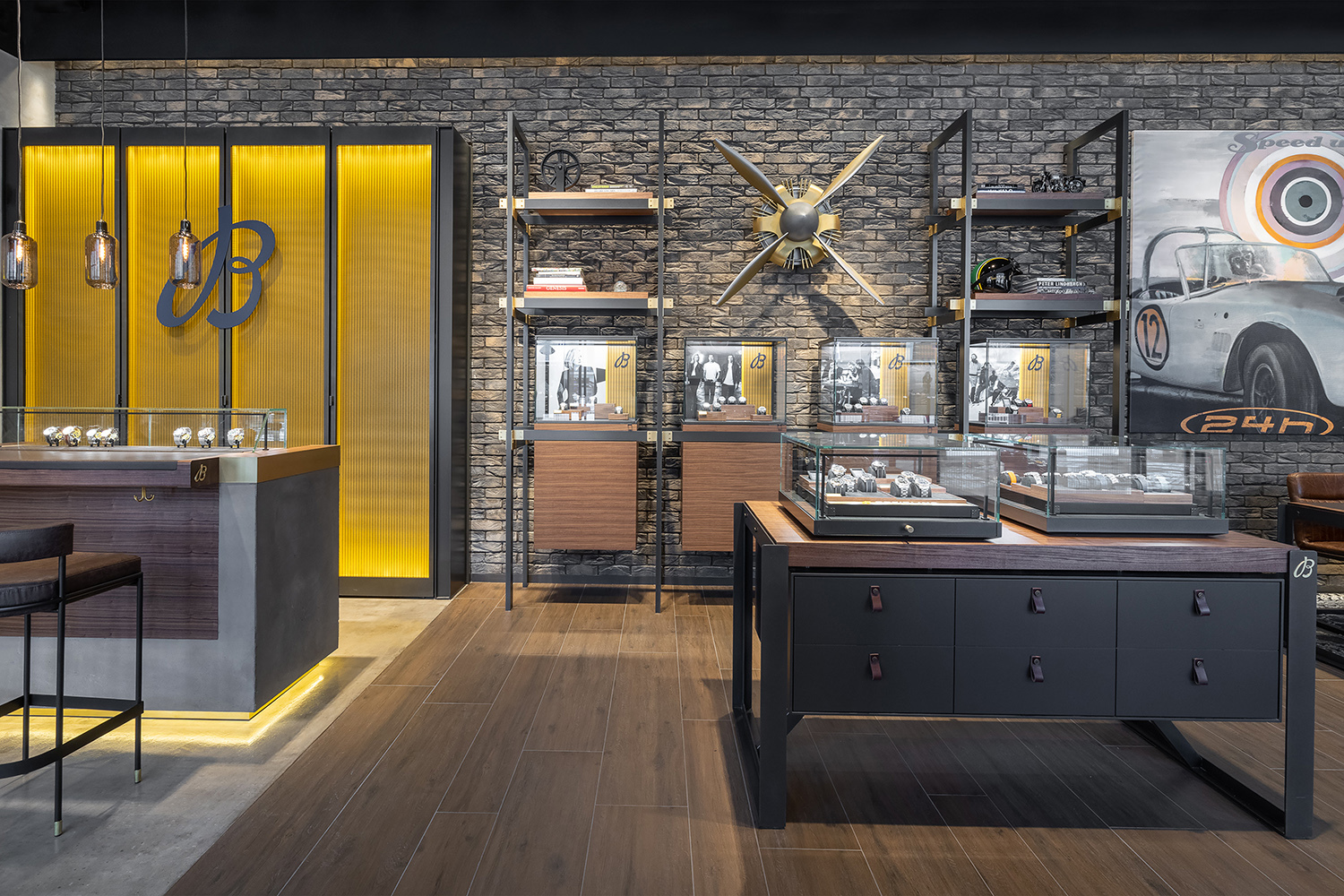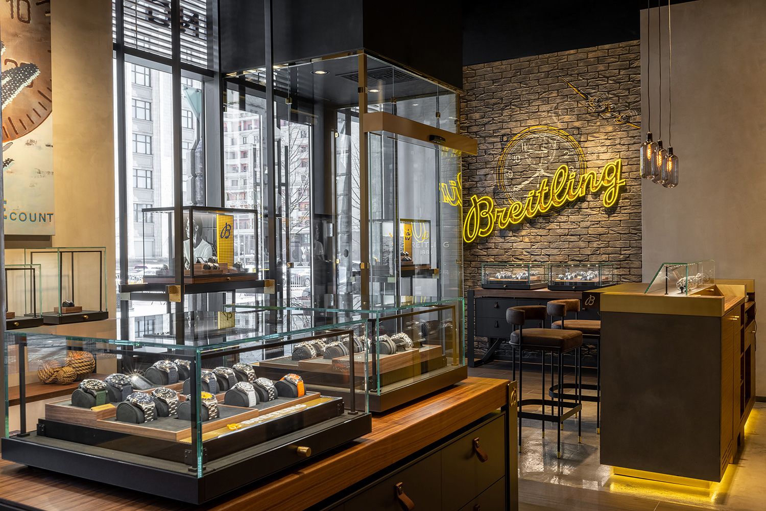 Интерьер «флагмана» выдержан в новой международной концепции Breitling, вдохновлен архитектурным стилем, характерным для промышленных зданий середины ХХ века и воссоздаёт атмосферу индустриального лофта в динамичной городской среде.