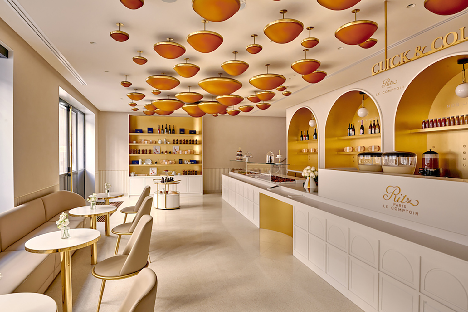 Интерьер Ritz Paris Le Comptoir, оформленный в пастельных тонах, черпает вдохновение в особой атмосфере отеля Ritz Paris., однако на потолке красуется светильник из 60 плафонов, повторяющих форму «прустовских» пирожных мадлен – визитной карточки кондитерской (писатель Марсель Пруст был одним из постояльцев отеля).