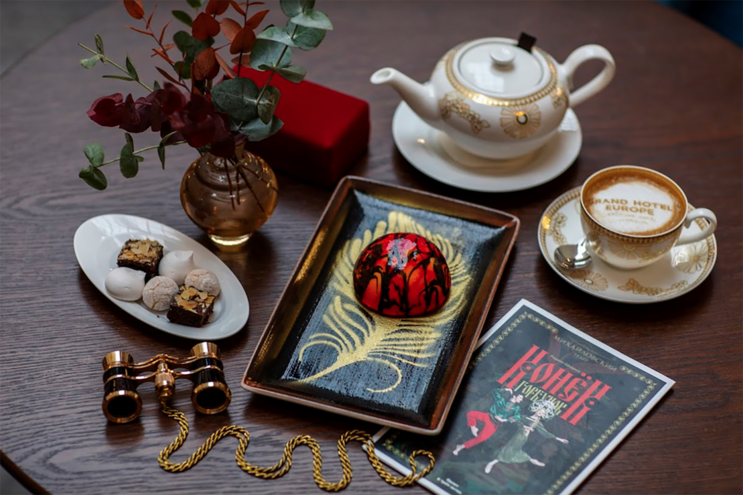 Одной из главных премьер сезона стала постановка балета «Конек-горбунок» в Михайловском театре. В сценическом оформлении балета использованы мотивы палехских росписей – и они вдохновили шеф-кондитера «Гранд Отеля Европа» Дмитрия Шибкова на создание десерта-посвящения «Перо Жар-птицы».