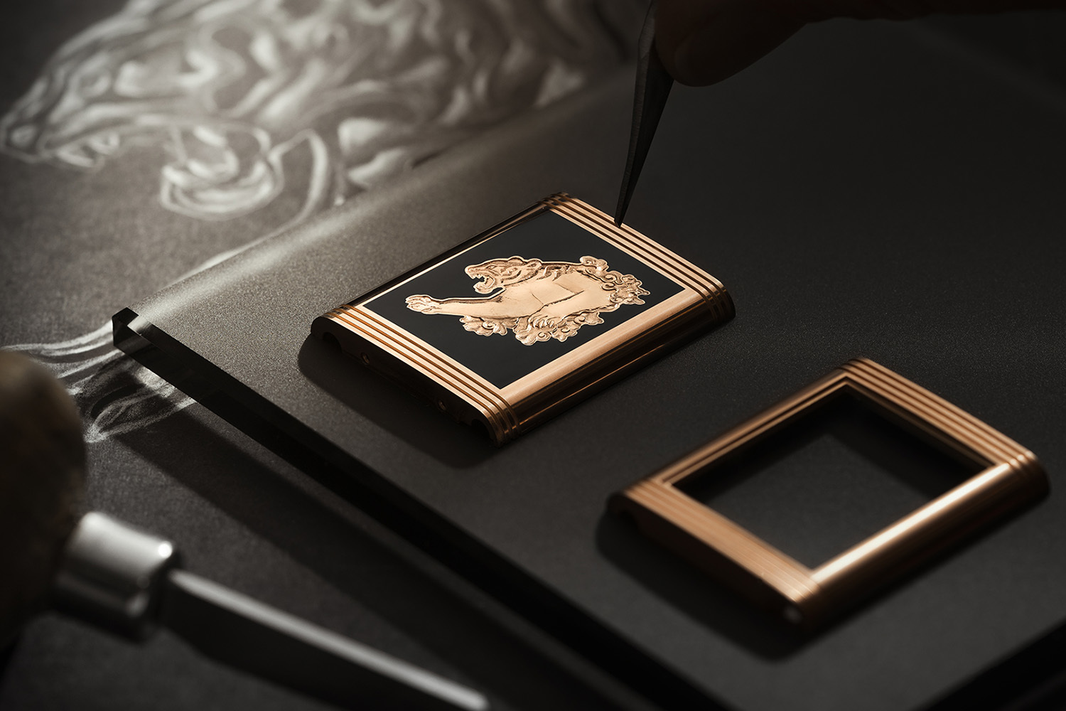 Обратная сторона часов из розового золота со знаменитым переворачивающимся корпусом (в 1931 году он был придуман, чтобы защитить стекло циферблата во время игры в поло) украшена гравировкой с изображением тигра.