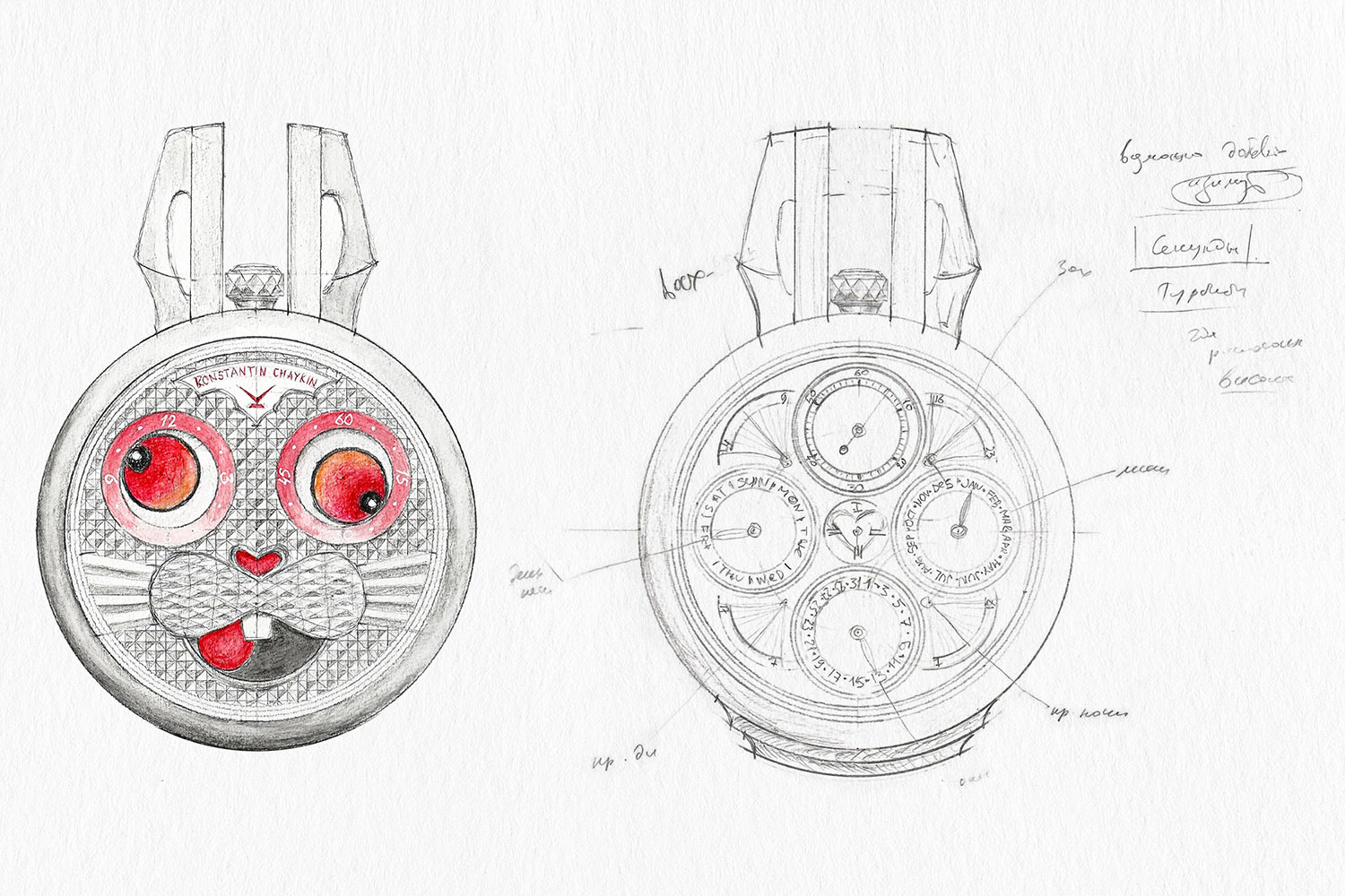 Это первые часы-трансформер в коллекции изобретений отечественного часовщика Константина Чайкина. Часы двусторонние и имеют два полноценных циферблата. Как следствие, используя застежку-подвеску, которая крепится к ушам кролика, часы можно носить как кулон или как карманные.