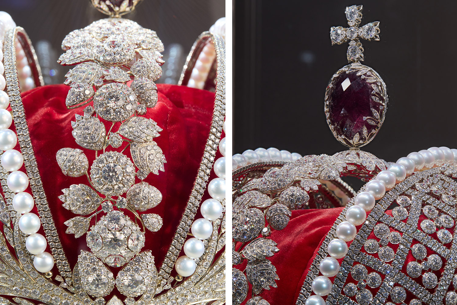 Работа над драгоценным шедевром также осуществлялась в крайне сжатые сроки – как это было и с оригиналом короны. Всего за несколько месяцев на свет появилось уникальное произведение ювелирного искусства из белого золота 585 пробы с 11352 бриллиантами общим весом в 1180 карат и 74 белыми с нежным розовым оттенком морскими жемчужинами из Австралии, добытых из диких устриц Pinctada maxima.