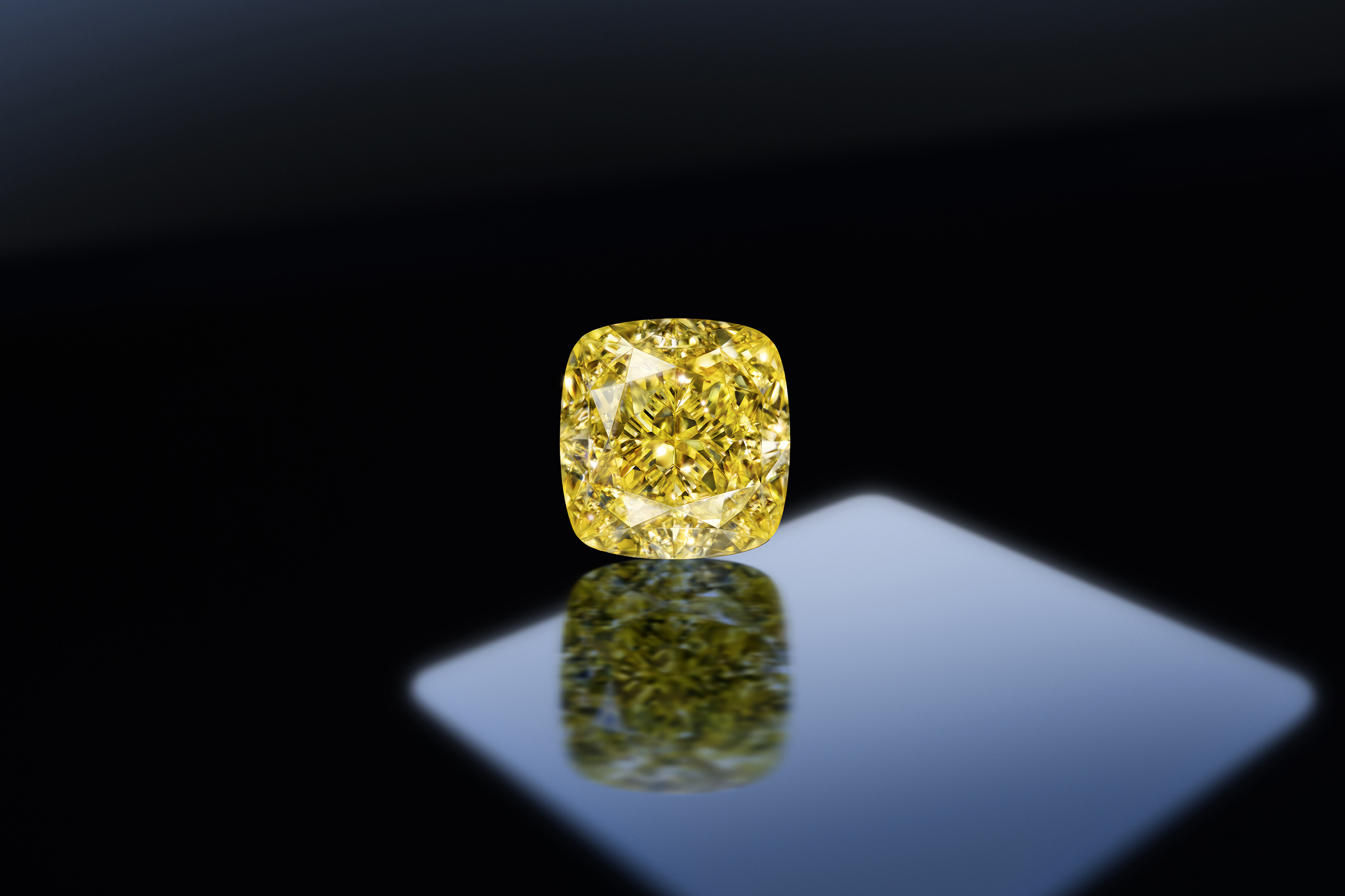Еще один по-настоящему королевский экземпляр – 11-каратный бриллиант фантазийного ярко желтого цвета (vivid yellow). Учитывая крупный размер, высокий уровень чистоты (VVS1), нехарактерный для цветных бриллиантов, а также полное отсутствие флуоресценции, этот бриллиант можно отнести к редчайшим произведениям природы.