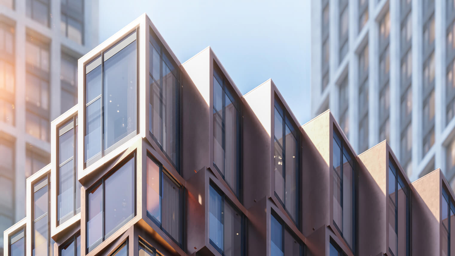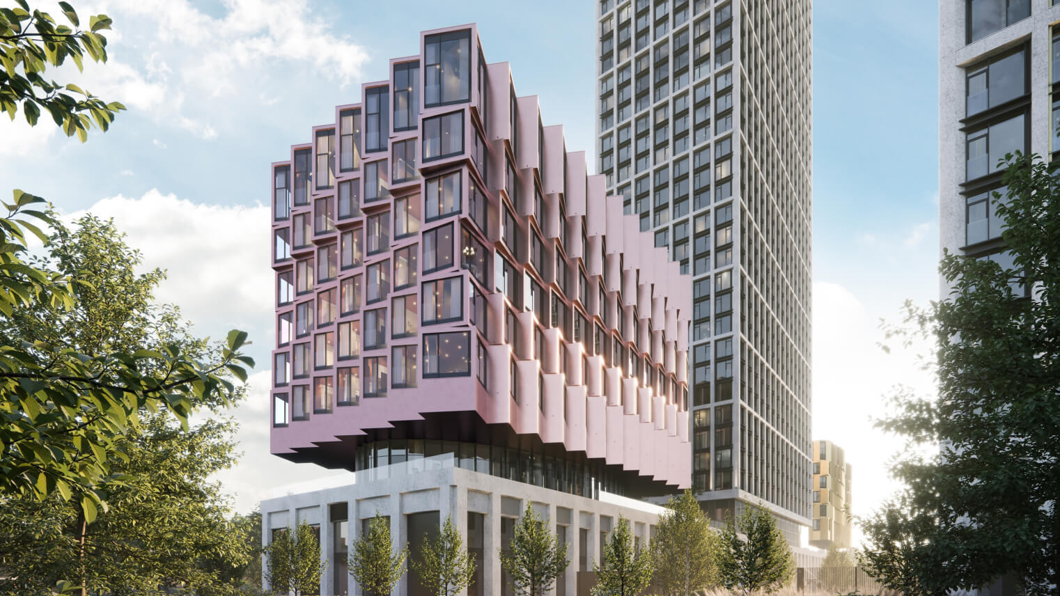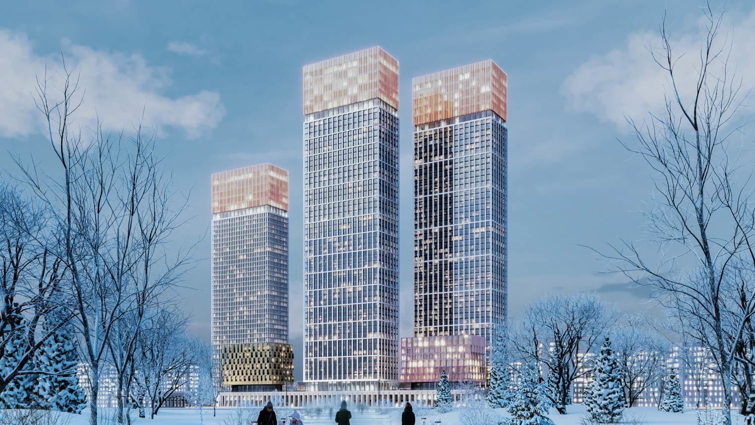 «Индивидуальность каждого из корпусов подчеркивается цветовыми решениями фасадов, в отделке использованы натуральный камень и анодированный алюминий. Силуэты трех тонких монолитных башен увенчаны светящейся янтарной короной. На контрасте со строгими пропорциями башен над стилобатом, как драгоценные камни, парят два невысоких объема с медным и золотым фасадами сложной формы», ‒ рассказывает сооснователь архитектурного бюро Kleinewelt Architekten Сергей Переслегин.