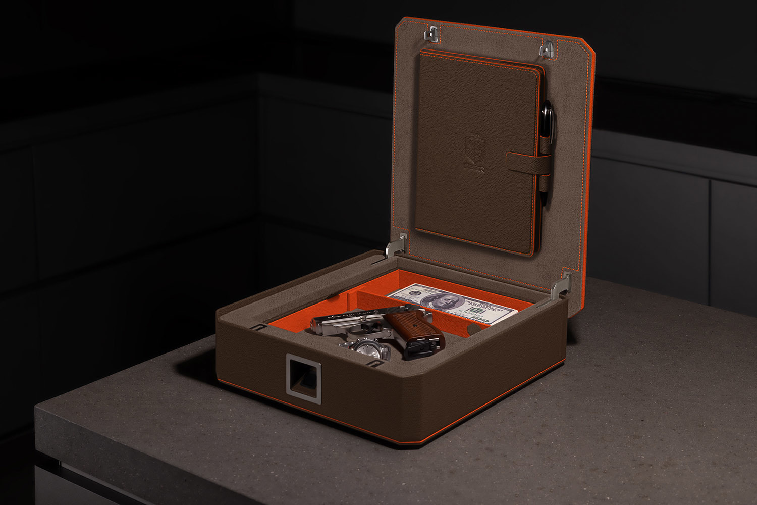 Внутренняя часть сейфа обита замшей, а фурнитура имеет покрытие из 24-каратного золота.