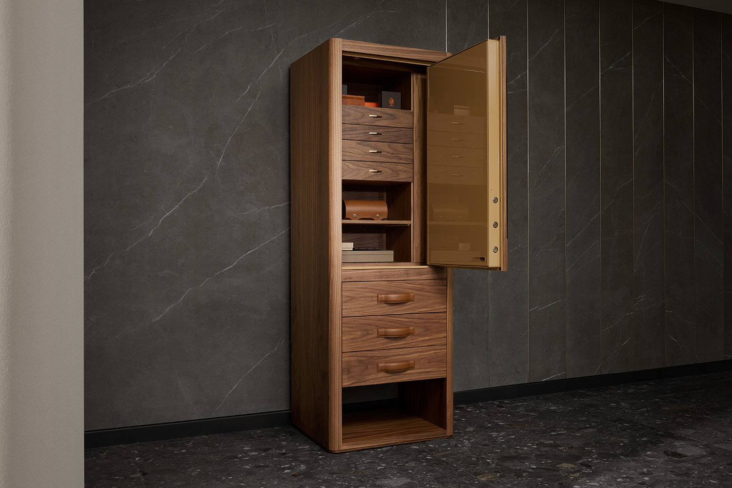 Сейфы Bork вручную изготавливают в Италии. Снаружи такой сейф выглядит как обычный шкаф: внешний корпус выполнен из ценной древесины ореха каналетто теплых глубоких оттенков.