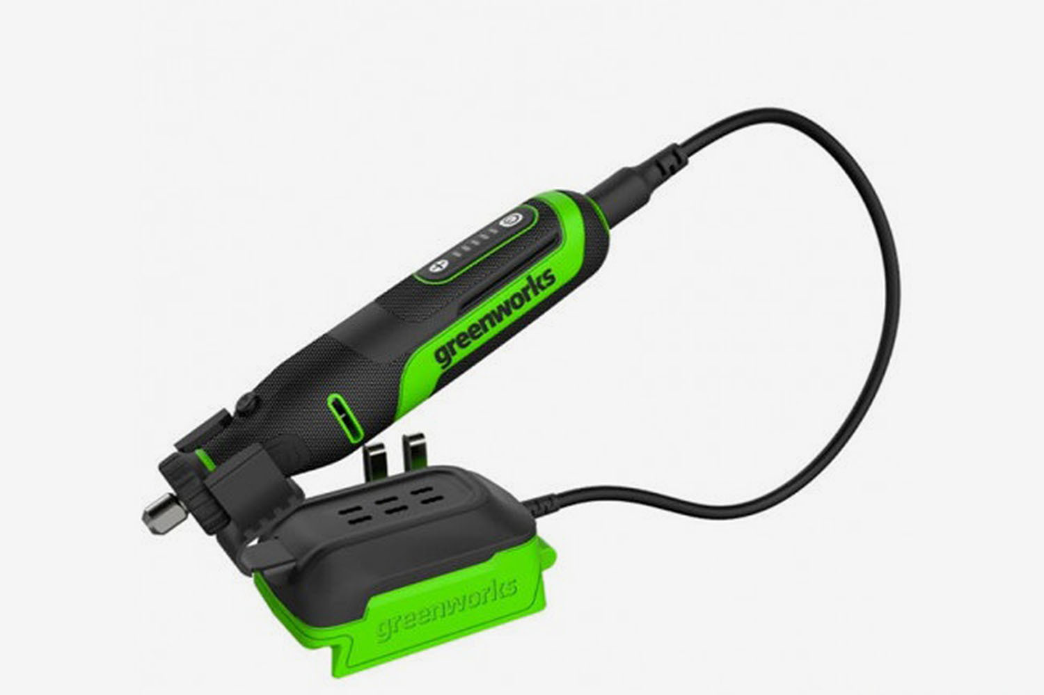 Один из самых подходящих девайсов категории «сделай сам», гравер позволяет открывает пути для творчества при работе с деревом, металлом или пластиком. Множество насадок (можно докупить набор из 216-ти) делает его подходящим для выполнения различных задач: от мелкой гравировки и резки до шлифовки и полировки, создания необычных подарков и украшений. Модель Greenworks G24RT идет с бесщеточным — а значит, максимально простым и надежным — мотором, кнопочно регулирует частоту вращения (от 6500 до 35000 об/мин), имеет плавный пуск и защиту от перегрузки и перегрева, а ее аккумулятор универсален и подойдет и для других инструментов серии.