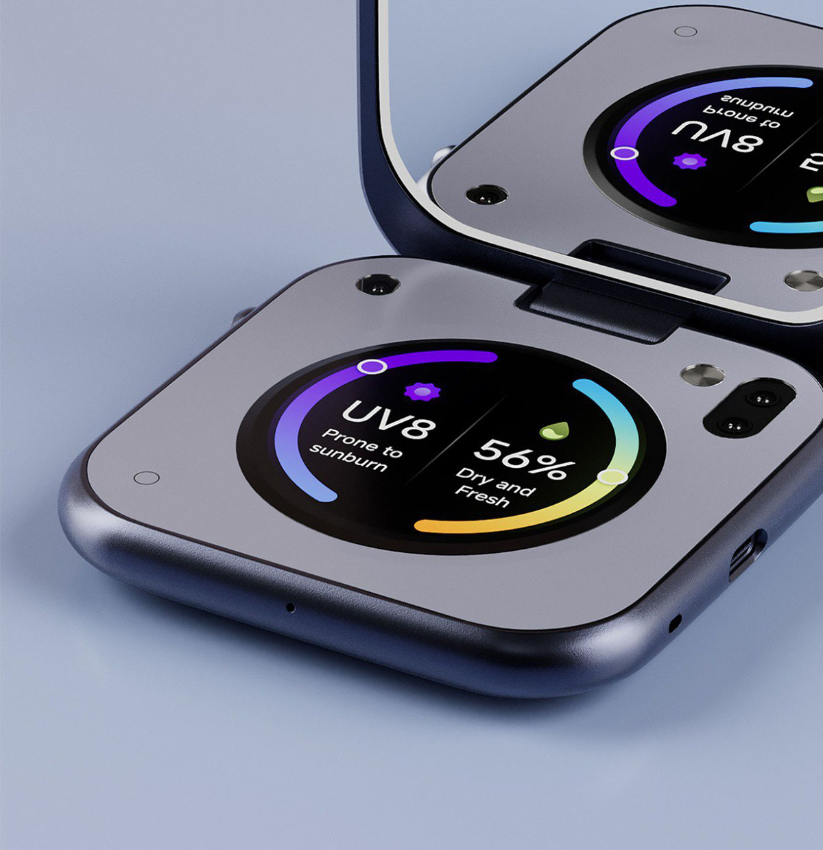 Почему бы ни сделать карманное зеркальце более продвинутым и способным не только показывать отражение (а также — похожим на смартфон-раскладушку)? В Bork реализовали эту идею: новинка предлагает новый формат ухода за кожей лица. А именно: встроенный бьюти-ассистент оценивает условия среды, которые влияют на красоту, а том числе уровень солнечного света и влажности, а ультрафиолетовая камера в режиме реального времени проверяет качество нанесения SPF защиты.