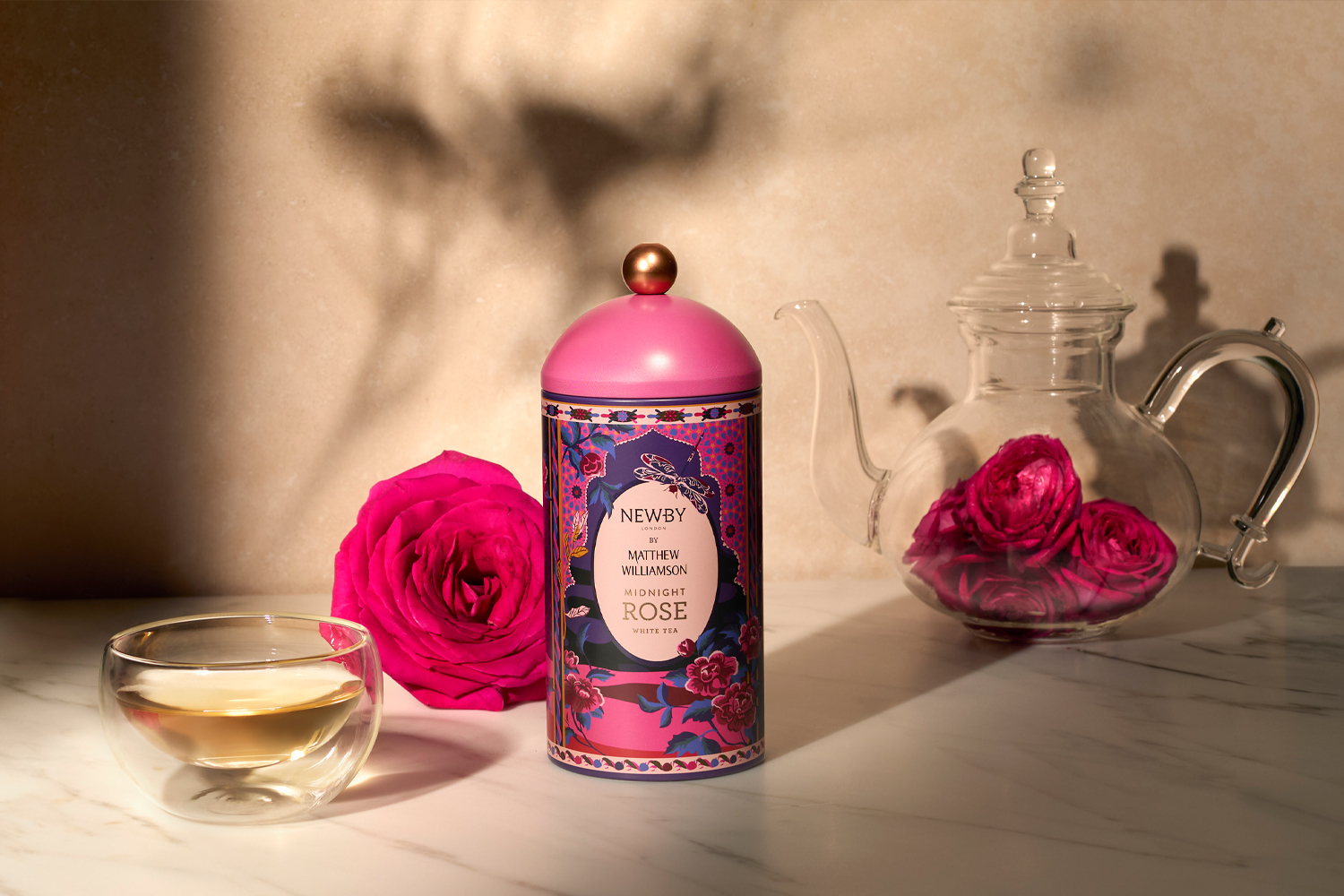 Уже во второй такой коллаборации – «Манящий восток» – сошлись два титана своих направлений: Newby Teas, чье имя стало синонимом высокого качества и сохранения чистоты чайных терруаров, и Мэтью Уильямсон, британский визионер, чьи произведения – будь то платье или интерьер – всегда напоминают взрыв тропического сада под аккомпанемент павлиньих перьев.